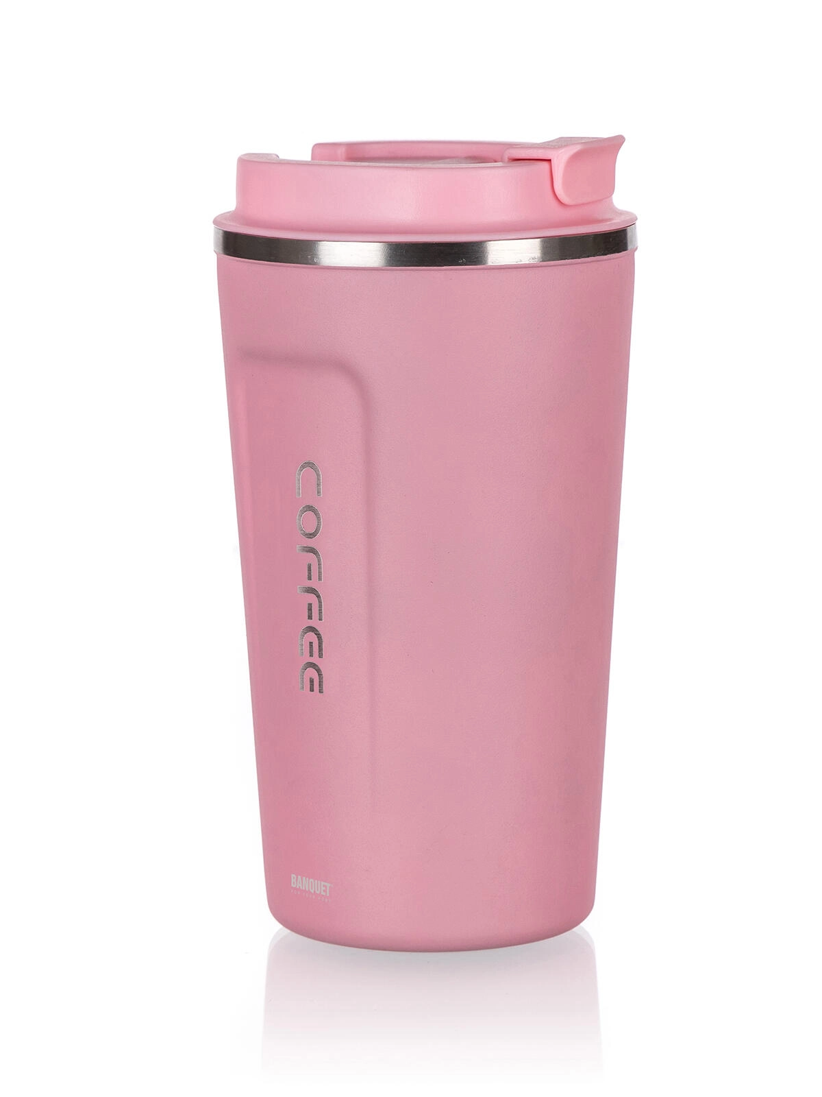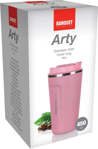 Cană termică de călătorie cu pereți dubli, stilată, ARTY 450 ml, în culoare roz, păstrează băuturile calde sau reci pentru mai mult timp. Are corp vidat din inox, capac practic și se potrivește confortabil în mână datorită dimensiunilor compacte.
