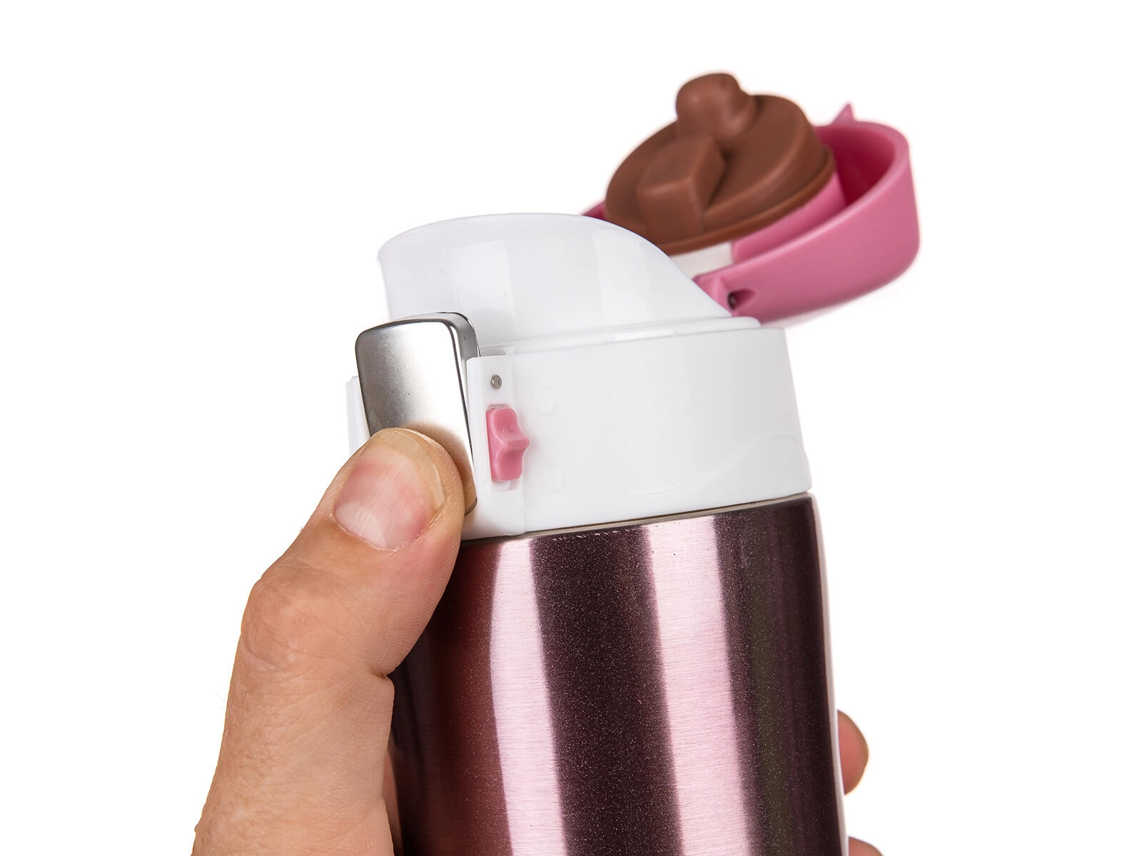 Capacul flip-top cu blocaj de siguranță se deschide printr-o singură apăsare, astfel încât puteți bea comod cu o singură mână – ideal în mașină, la birou sau la plimbare. Etanșarea inteligentă și sistemul de siguranță reduc la minimum riscul de vărsare în geantă sau rucsac.