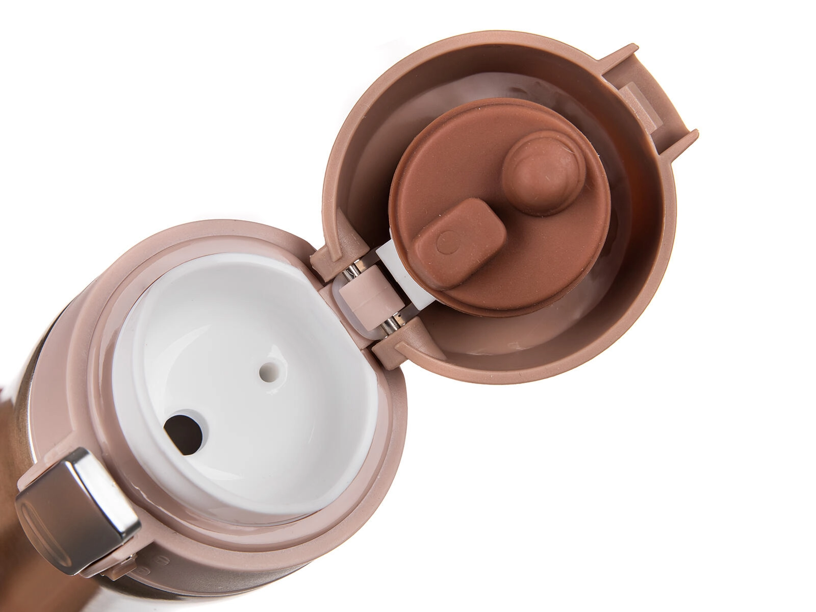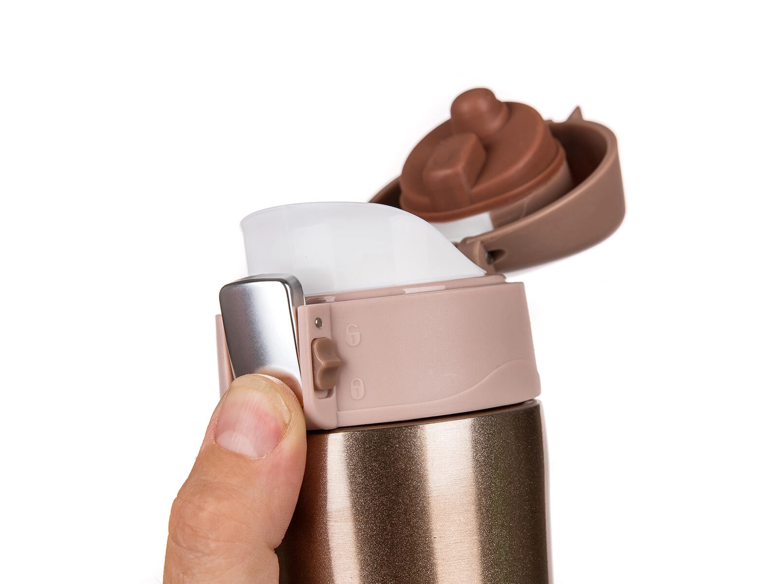 Capacul se deschide ușor prin apasarea siguranței și este completat de un lacăt de siguranță care previne deschiderea accidentală în geantă. Muștiucul conceput cu grijă, cu orificiu de aerisire, asigură turnare și băut cursiv, fără vărsări.