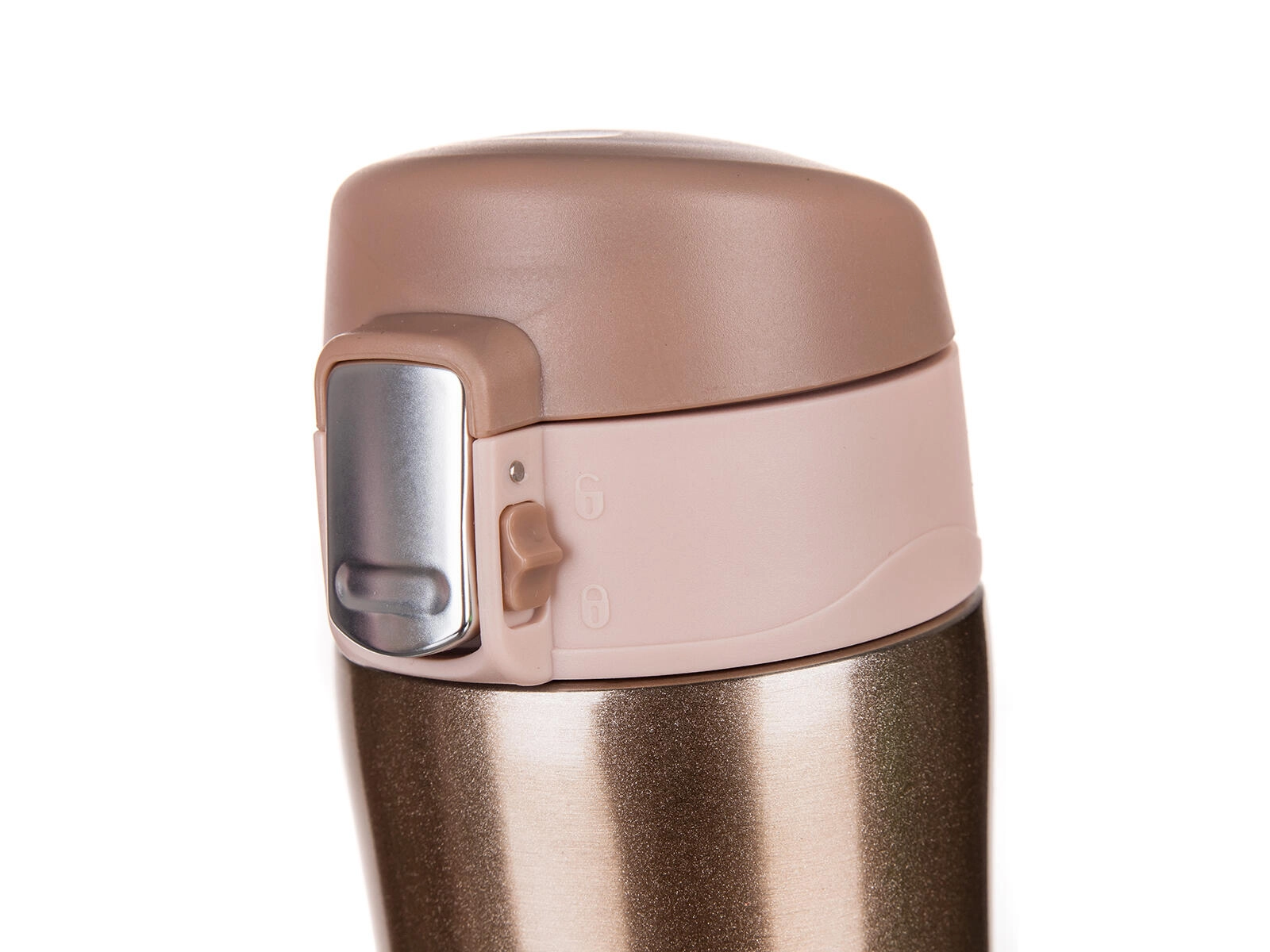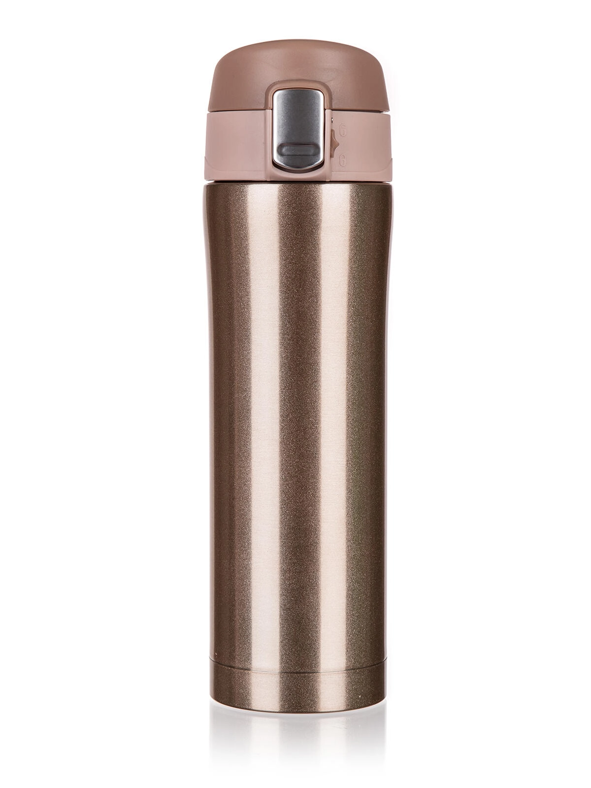 Eleganta termosă BODO, în auriu metalic, combină oțelul inoxidabil la interior și exterior cu o deschidere cu o singură mână inteligentă. Datorită izolației de calitate, menține cafeaua, ceaiul sau apa la temperatura optimă mai mult timp, fie că ești la volan, la birou sau în excursie.