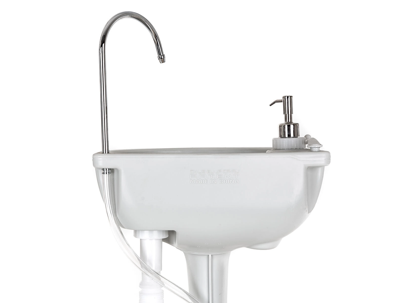 Păstrați-vă mâinile curate chiar și departe de racordurile clasice. Acest lavoar portabil pe stativ oferă spălare stabilă și confortabilă datorită pompei cu picior, care asigură un flux de apă lin și fără contact. Dozatorul integrat de săpun lichid și cârligul pentru prosop sporesc confortul în utilizarea zilnică pe teren.
