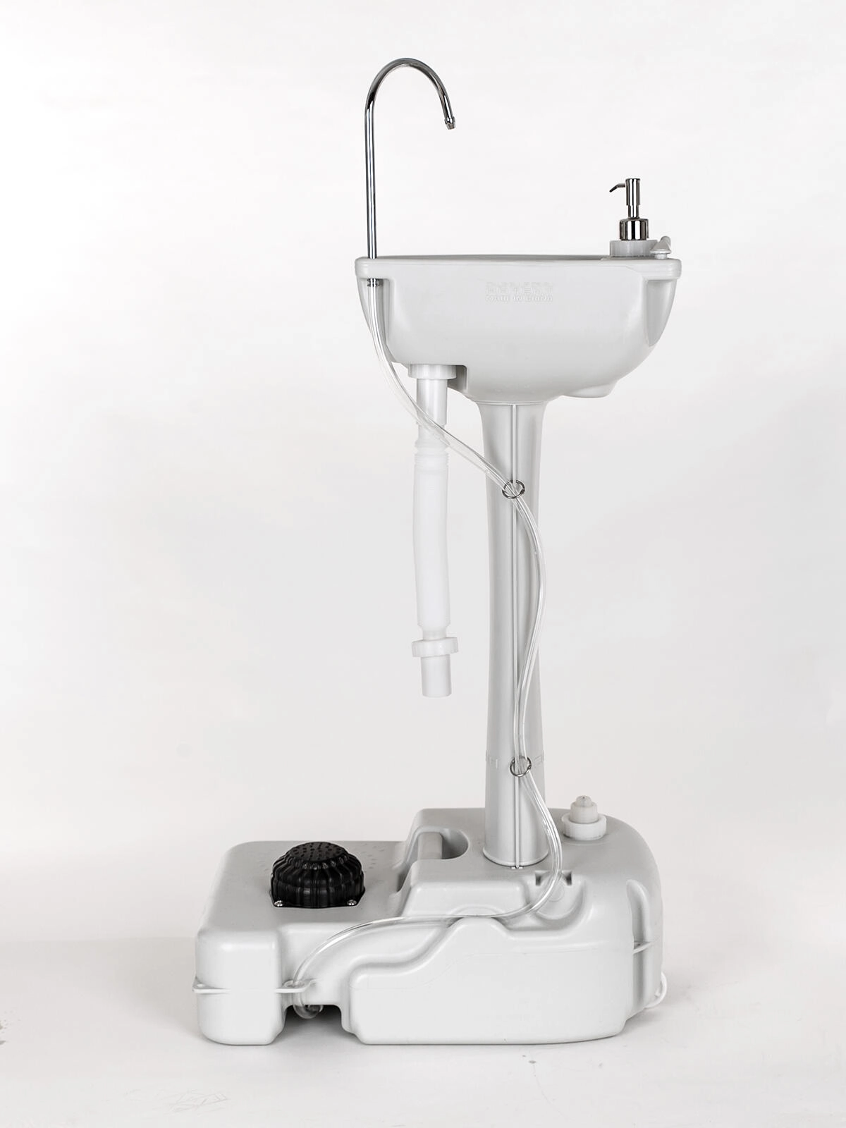 Rezervorul generos pentru apă curată, cu o capacitate de 17 litri, permite funcționare îndelungată fără reumpleri frecvente. Apa uzată se evacuează ușor prin furtunul conectat într-un recipient dedicat sau într-un loc sigur. Pentru un set mobil complet, lavoarul poate fi conectat la o toaletă portabilă, unde apa uzată de la lavoar este folosită ulterior pentru spălare.