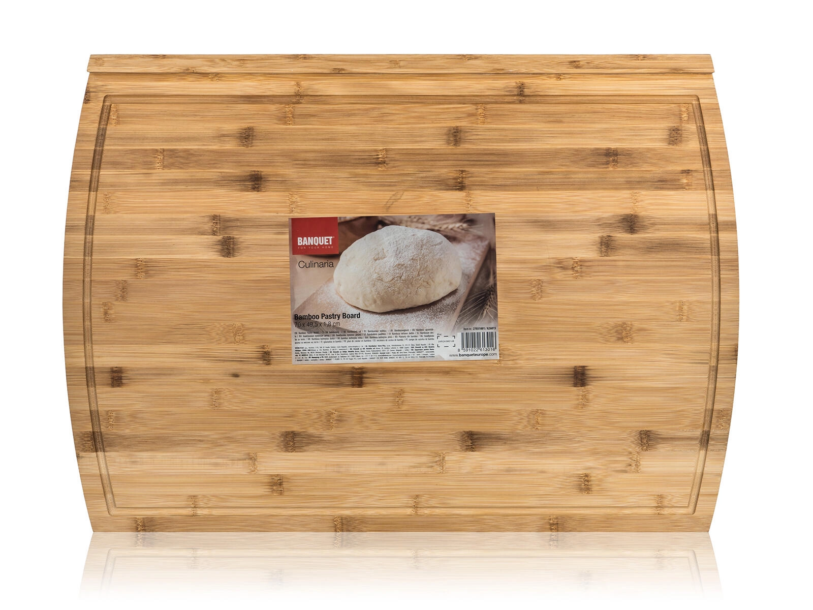 Planșeta practică din bambus CULINARIA, cu dimensiunile 70 × 49,5 × 1,8 cm, este ideală pentru coptul de zi cu zi. Oferă o suprafață de lucru mare, lemn de bambus rezistent și o bază stabilă pentru întinderea confortabilă a aluatului și prepararea produselor de patiserie.