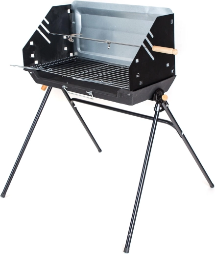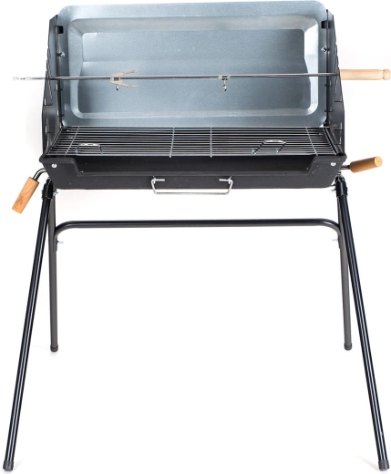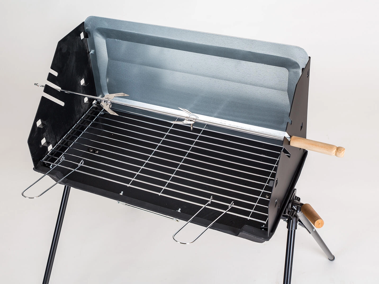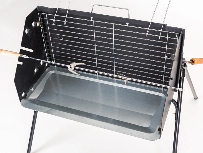 Rotisorul cu două furci duble este inclus în pachet, astfel că puteți pregăti cu ușurință pui la rotisor, rulade sau bucăți mai mari de carne. În regim vertical, sucul se scurge în zona de colectare, departe de cărbunii încinși, ceea ce minimizează fumul și susține o preparare mai sănătoasă. În plus, puteți adauga combustibil în timpul funcționării fără a fi necesară manipularea grătarului.