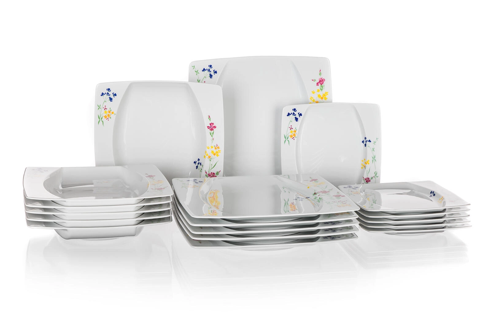 Elegantul set de masă EYE cu 18 piese, din porțelan de calitate THUN, în formă pătrată modernă, va oferi mesei tale un stil proaspăt. Farfuriile cu decor floral discret au o suprafață lucioasă, sunt stivuibile și potrivite pentru mașina de spălat vase și cuptorul cu microunde.