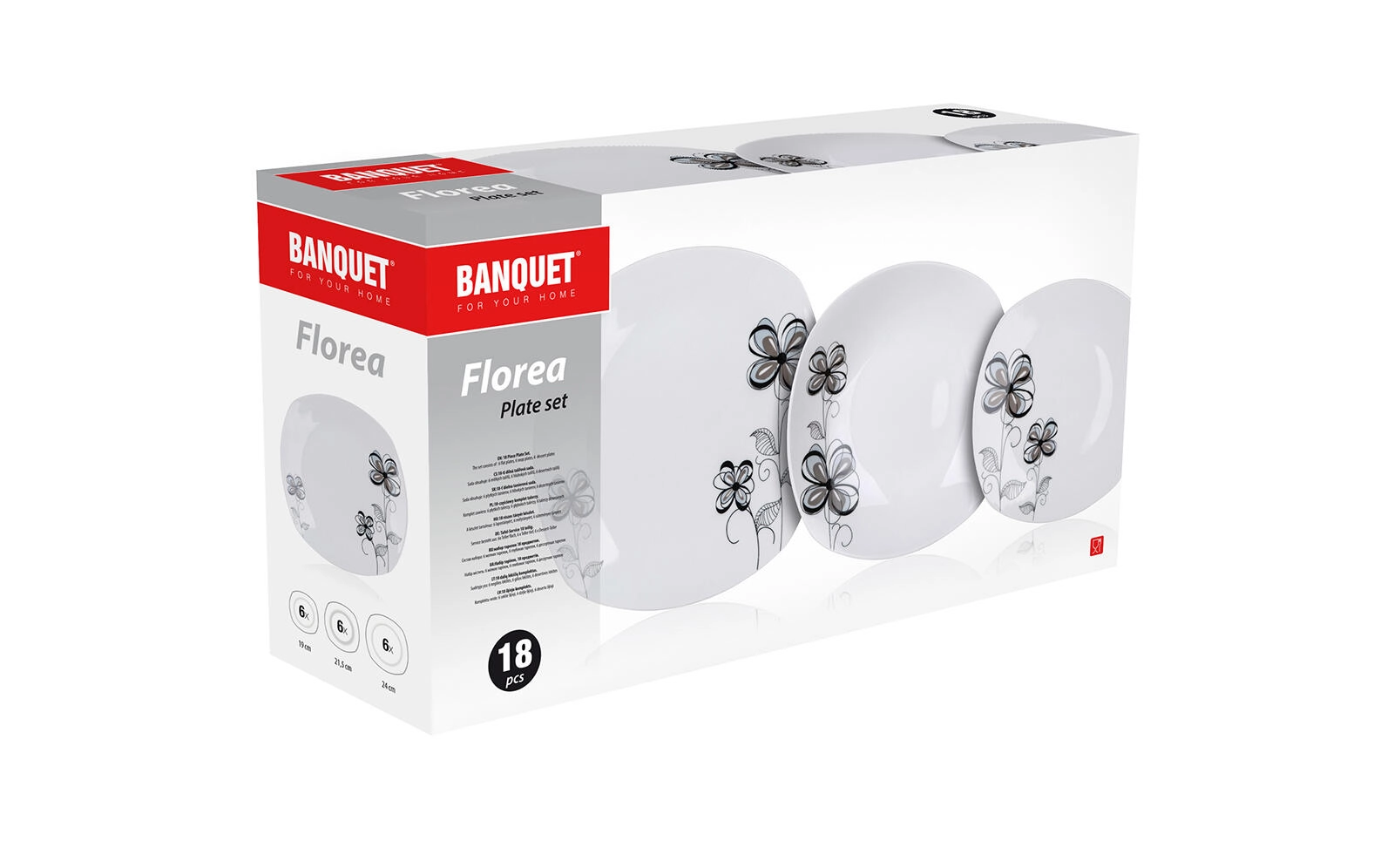Elegantul set de farfurii din porțelan FLOREA Square, în culoare albă, aduce un design modern cu motiv floral pentru mesele zilnice și festive. Conține 18 piese pentru 6 persoane și oferă farfurii adânci, întinse și pentru desert cu formă dreptunghiulară cu colțuri rotunjite. Toate piesele sunt potrivite pentru mașina de spălat vase și cuptorul cu microunde.
