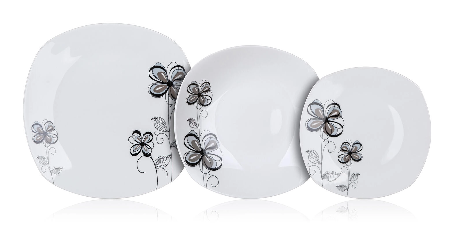 Setul de masă FLOREA Square, realizat din porțelan de calitate, se remarcă prin forma modernă cu colțuri rotunjite și decorul floral discret în nuanțe de negru și gri. Este ideal pentru servirea supelor, felurilor principale și deserturilor și se asortează ușor cu restul veselei de pe masă.