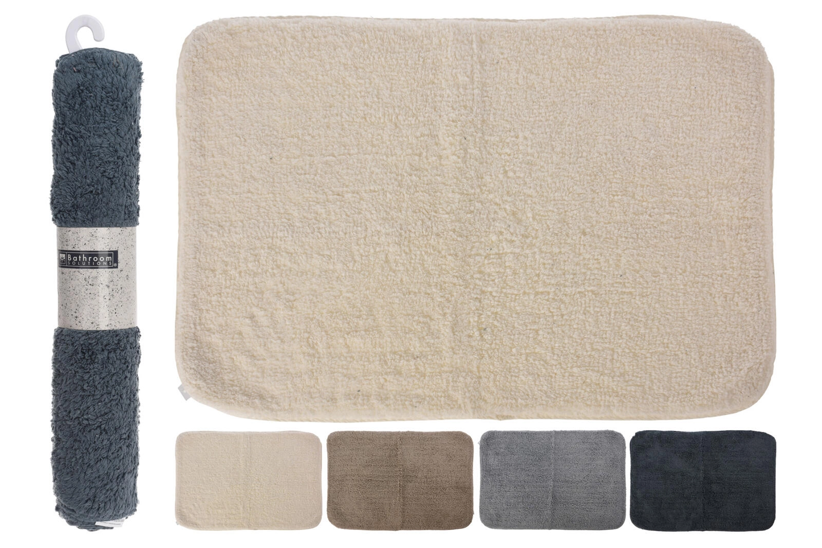 Datorită dimensiunii universale de 60 × 90 cm, este potrivit în fața căzii, dușului sau lavoarului. Selecția neutră de culori în mix de crem, maro, gri și gri închis se potrivește cu majoritatea interioarelor de baie și le conferă un aspect curat și modern.