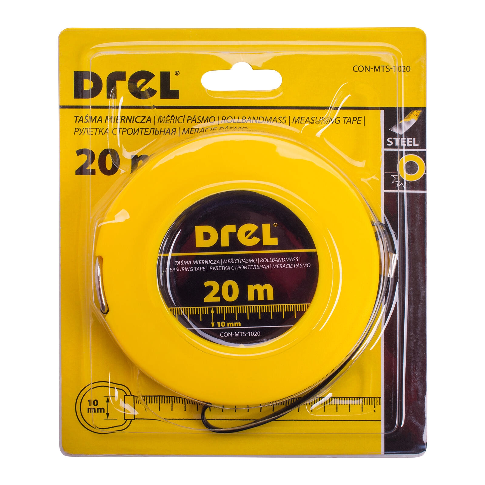 Practică și durabilă, ruleta din oțel 20 m × 10 mm Drel pentru măsurători precise pe șantier, în atelier și în grădină. Oferă bandă din oțel rezistentă, carcasă întărită și manivelă rabatabilă pentru derulare rapidă și comodă.