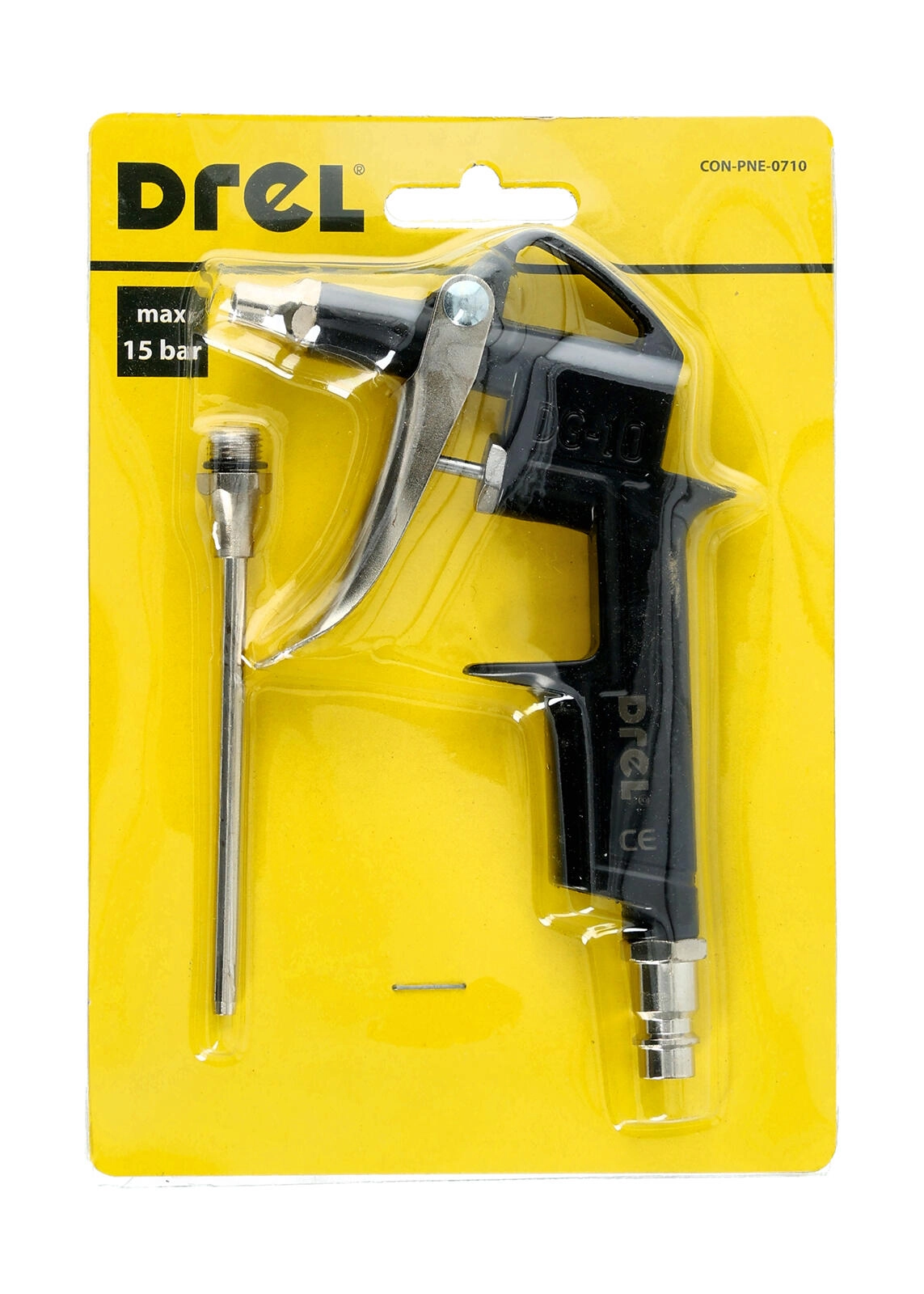Pistolul de suflare Drel este un ajutor de încredere pentru atelier, garaj și producție. Datorită carcasei robuste din aluminiu, rezistă utilizării solicitante, rămânând în același timp ușor și ușor de manevrat. Duza îngustă cu diametrul de 2 mm asigură un jet de aer concentrat pentru îndepărtarea eficientă a prafului, rumegușului, așchiilor sau impurităților din zone greu accesibile.
