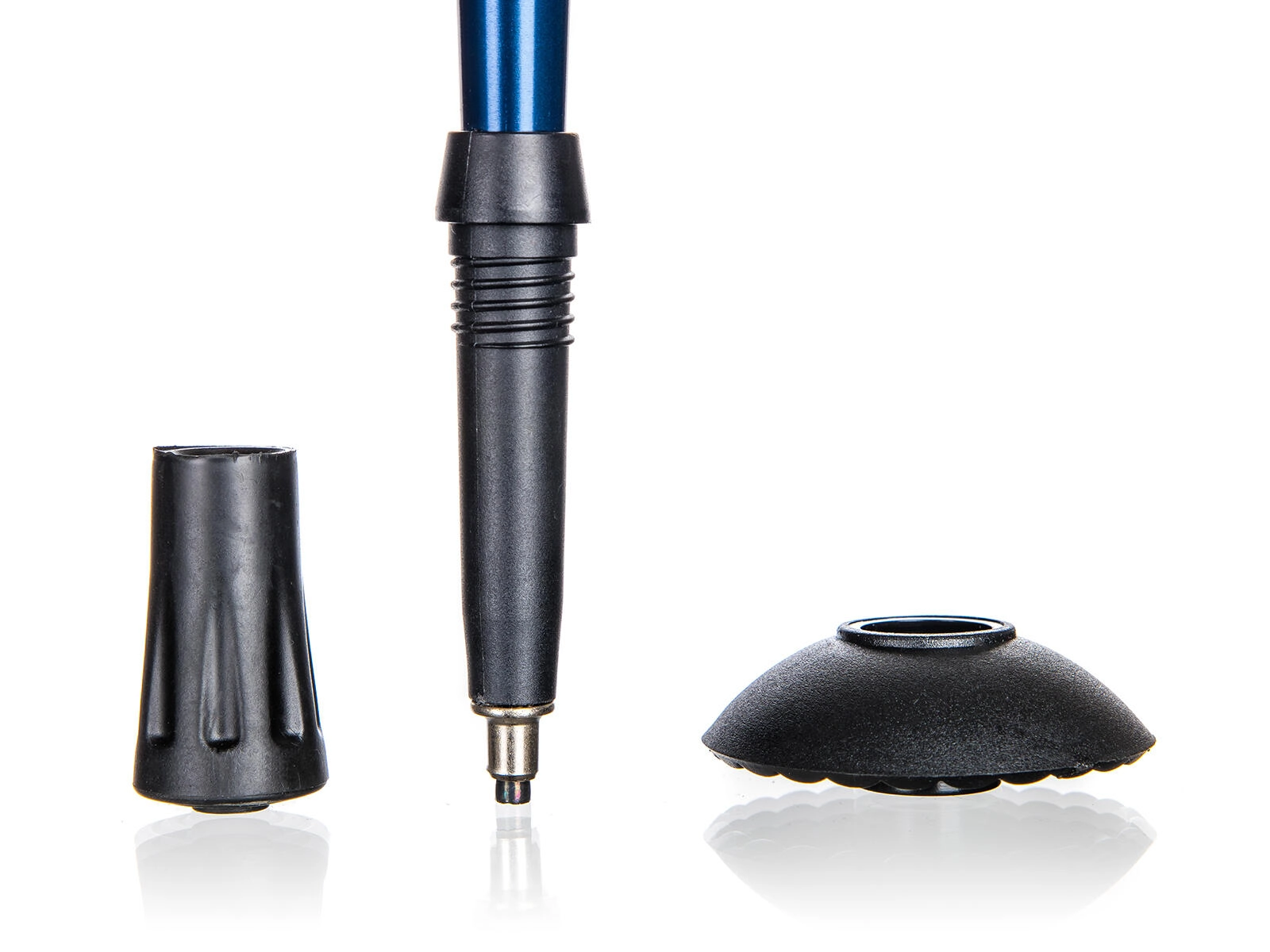 Mânerul din cauciuc modelat ergonomic, cu chingi, oferă o priză sigură și confortabilă. Vârful din oțel pătrunde în substraturi moi și transferă eficient forța pentru stabilitate maximă, în timp ce capacul din cauciuc este ideal pentru suprafețe dure și plane. Rozetele interschimbabile permit utilizare pe tot parcursul anului – rozetele mai late sunt utile pe zăpadă.