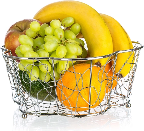 Coșul elegant din sârmă pentru fructe VANITY, cu diametrul de 24 cm și înălțimea de 10 cm, este ideal pentru utilizarea zilnică în bucătărie. Fabricat din sârmă de oțel durabilă cu finisaj cromat de calitate, oferă durată lungă de viață, întreținere ușoară și depozitare aerisită a fructelor, ceea ce ajută la menținerea alimentelor proaspete pentru mai mult timp.