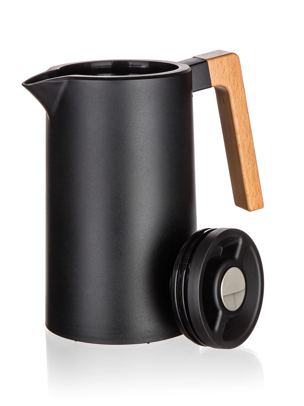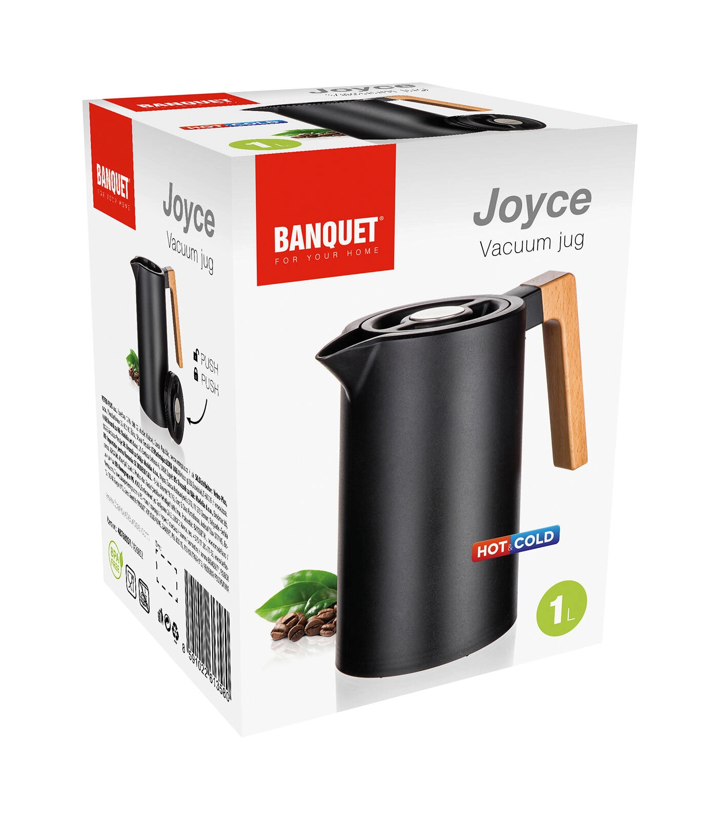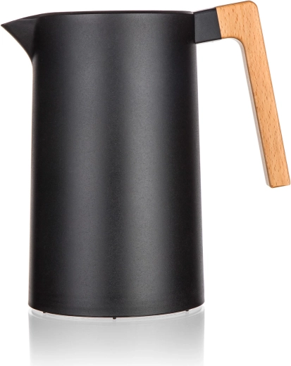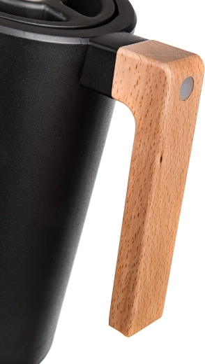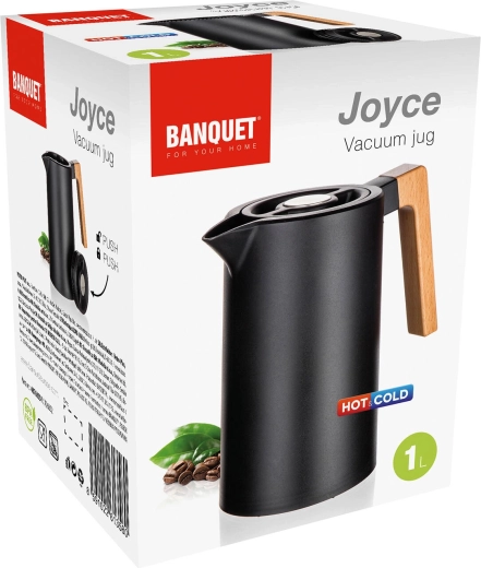 Carafa termică Joyce îmbină designul modern în culoare neagră cu funcționalitatea de zi cu zi. Pereții dubli din inox cu izolație în vid mențin eficient temperatura, în timp ce capacul cu siguranță rotundă permite turnarea printr-o singură apăsare – fără desfiletare inutilă și fără pierderi de căldură.