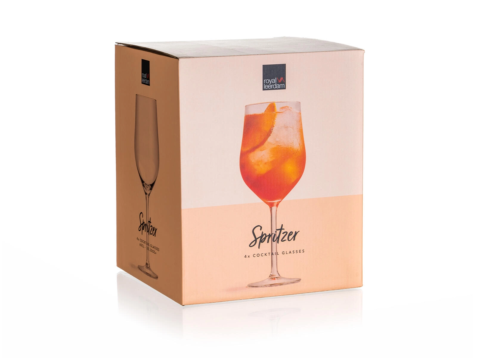 Bucurați-vă de spritzere răcoritoare, long drink-uri sau cocktailuri fără alcool în paharele stilate SPRITZER de 600 ml. Marca ROYAL LEERDAM garantează o prelucrare precisă și o transparență clară a sticlei, care evidențiază culoarea și perlajul băuturii.
