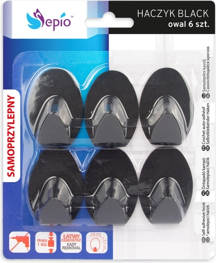 Cârlige autoadezive practice și stilate, în formă ovală, din oțel de calitate, în culoare neagră elegantă. Datorită benzii adezive puternice oferă instalare rapidă fără găurire și fixare fiabilă pe diverse suprafețe din întreaga locuință. Pachetul conține 6 bucăți pentru utilizare universală în bucătărie, baie, hol și birou.