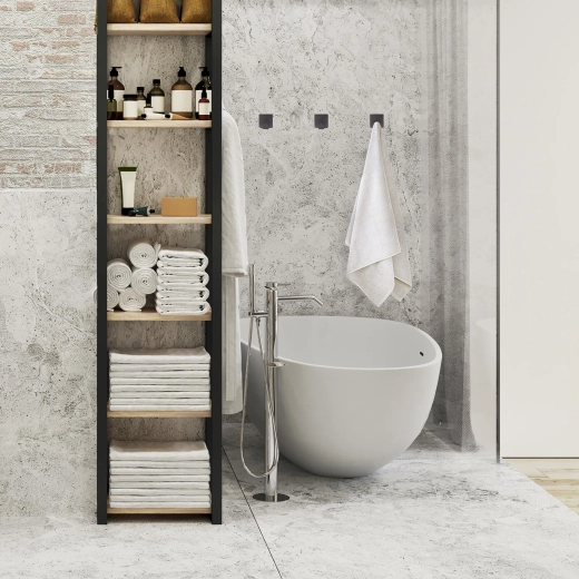 Finisajul negru mat și forma compactă se potrivesc în baie, bucătărie și hol, completând discret amenajarea.