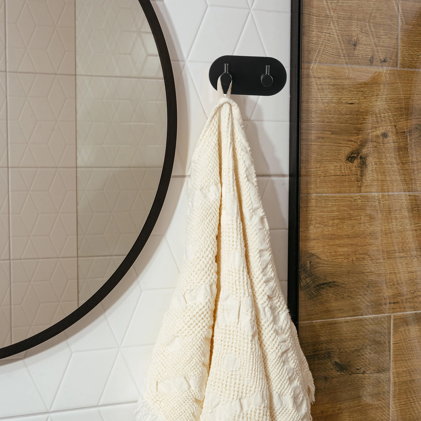 Un cârlig dublu autoadeziv practic și elegant, din metal, în culoare negru mat, potrivit pentru băi, holuri și bucătării. Datorită stratului autoadeziv puternic, se montează ușor fără găurire și fără a deteriora faianța. Dimensiunile compacte 9,5 × 8 × 4,5 cm și două cârlige robuste asigură ordine pentru prosoape, halate sau chei.