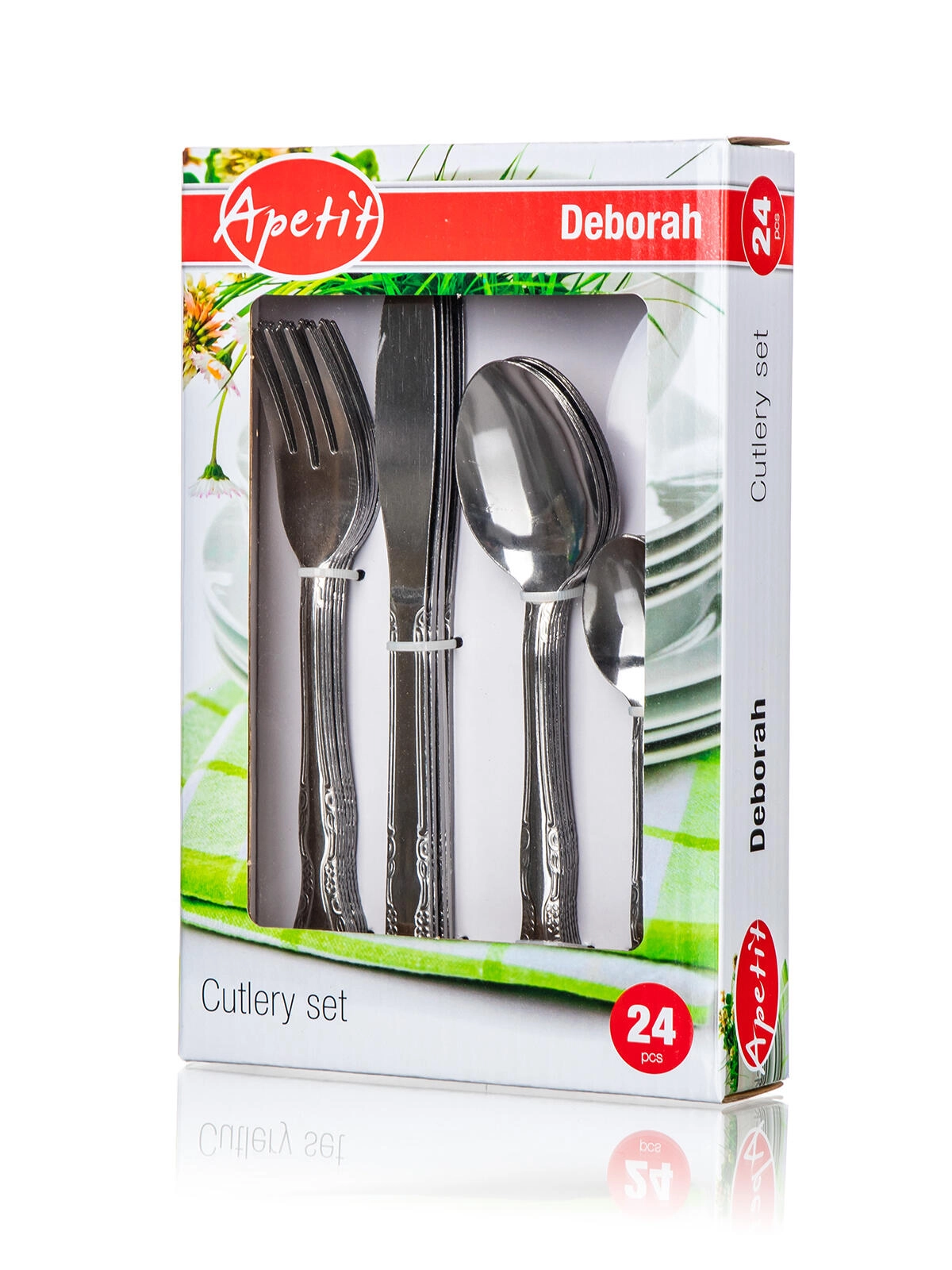 Setul de tacâmuri APETIT Deborah se remarcă prin decorul atemporal al mânerelor și calitatea de încredere a oțelului inoxidabil. Este ideal pentru casă, cabană sau pentru oaspeți – totul asortat într-un design unitar pentru o masă perfect aranjată.