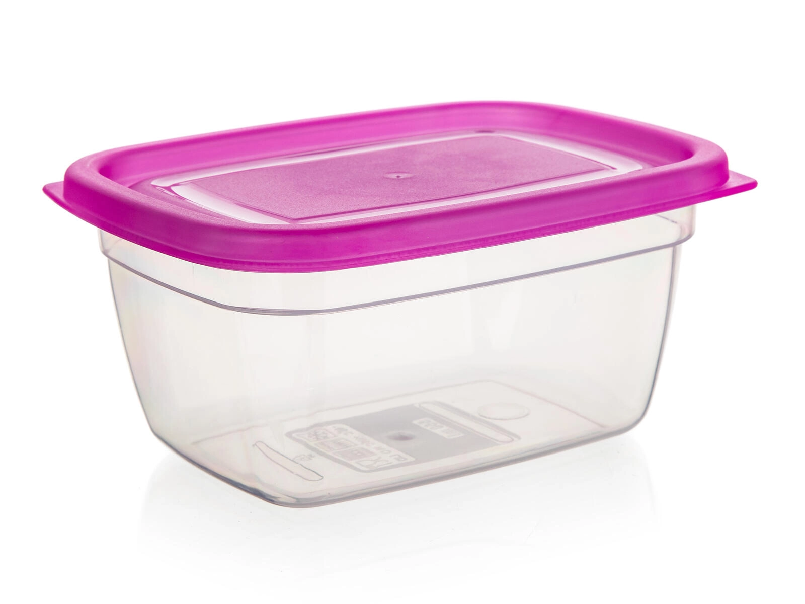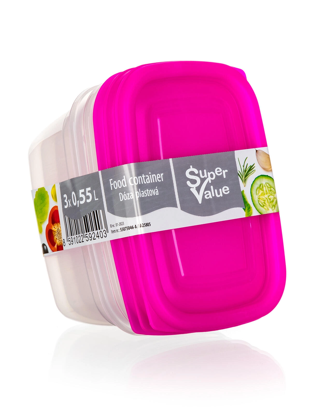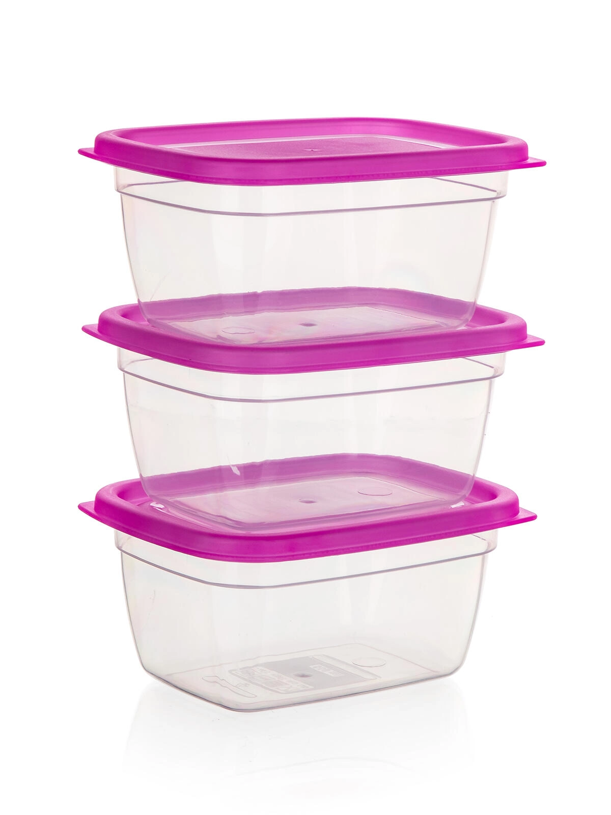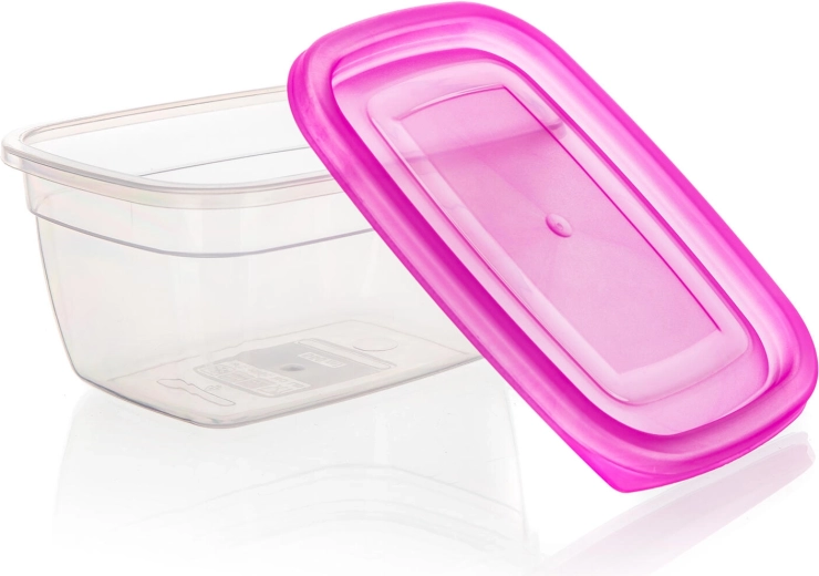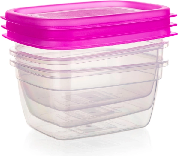 Set practic din 3 piese de cutii din plastic cu volum de 0,55 l pentru depozitarea zilnică a alimentelor. Recipiente transparente cu capace roz pentru o identificare ușoară a conținutului, reutilizabile, ușoare și potrivite pentru organizarea frigiderului și a cămării.