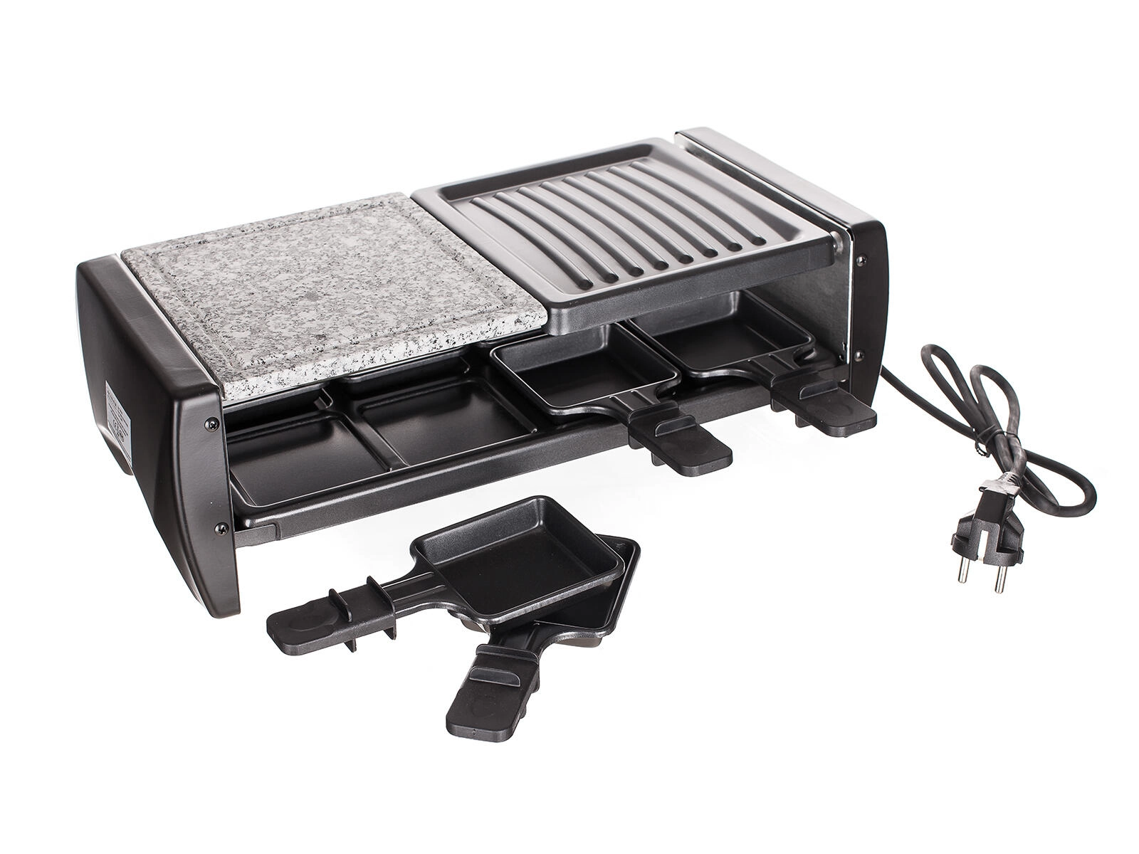 Opt tigăițe antiaderente permit fiecărui invitat să-și pregătească propriul raclette, legume sau mini-omletă, fără lipire și cu minimum de ulei.