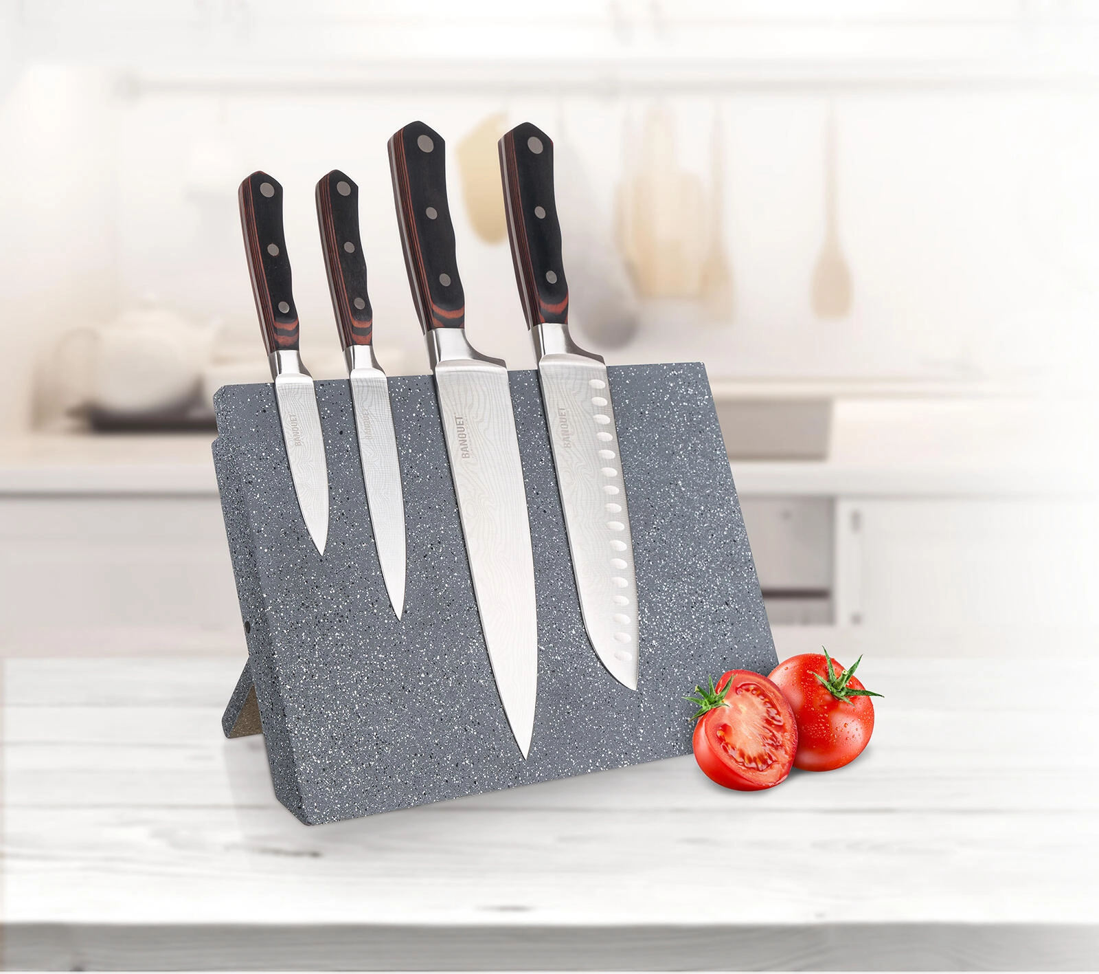 - Lamă universală de 20 cm pentru majoritatea sarcinilor din bucătărie – de la ierburi la carne.