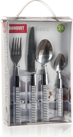 Setul de tacâmuri Lines, 24 piese, este ideal pentru servirea completă a mesei pentru șase persoane. Combină oțel inoxidabil 18/0 rezistent cu mânere decorative din plastic, plăcute la atingere, care oferă mesei dvs. un aspect modern. Finisajul lucios al tacâmurilor conferă eleganță și este ușor de întreținut.