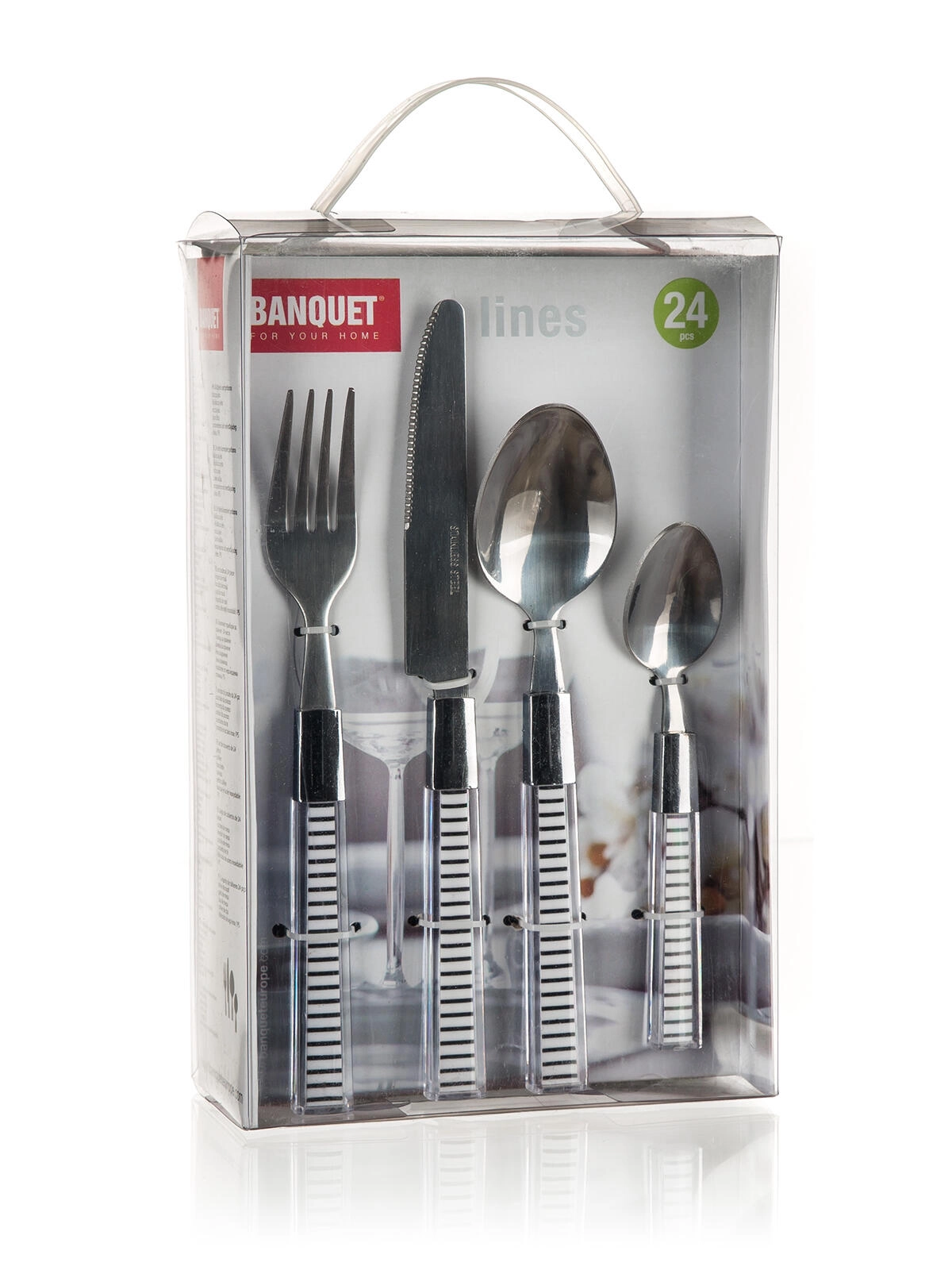 Elegantul set de tacâmuri Lines pentru 6 persoane oferă confort și stil în fiecare zi. Conține 24 de piese: 6x lingură pentru supă, 6x furculiță, 6x cuțit de masă și 6x linguriță pentru ceai. Fabricat din oțel inoxidabil 18/0, grosime 1,8 mm, cu finisaj lucios și mânere din plastic cu decor. Alegere practică pentru gospodărie, suprafață din inox lucios și mânere confortabile din plastic. Tacâmurile nu sunt potrivite pentru mașina de spălat vase.