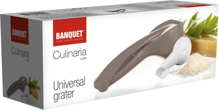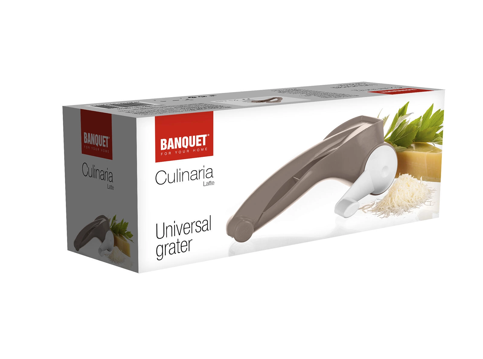 Răzătoare universală practică cu moară CULINARIA Latte pentru răzuire rapidă și fină. Tamburul din oțel inoxidabil cu lățimea de 7 cm asigură rezultate fine la procesarea brânzeturilor, nucilor și ciocolatei. Răzătoarea este ușor de întreținut și potrivită pentru dreptaci și stângaci.