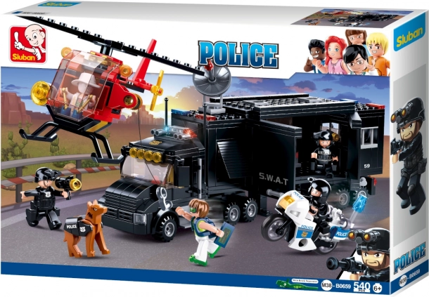 Piesa principală a setului este camionul SWAT negru – o bază mobilă cu detalii realiste, care servește drept centrală pentru toate acțiunile poliției. Ideală pentru deplasări tactice și planificarea intervențiilor.