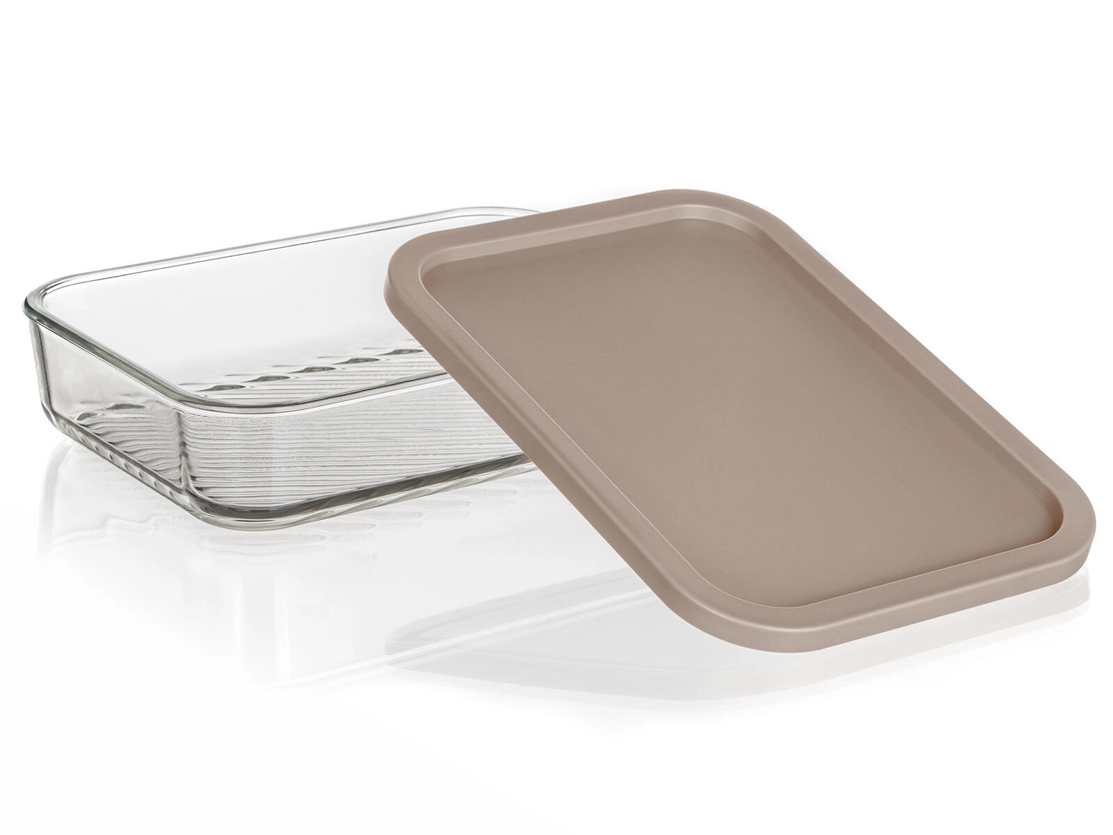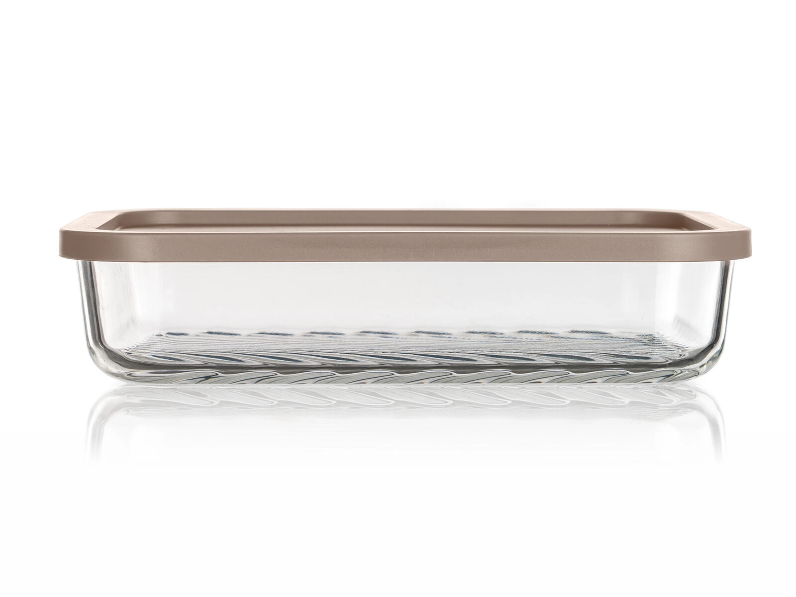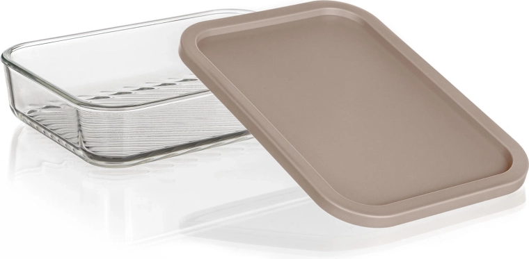 Formatul dreptunghiular 22,5 × 16 × 5 cm economisește spațiu în frigider și congelator. Sticla transparentă cu fund striat mărește stabilitatea și facilitează verificarea conținutului.