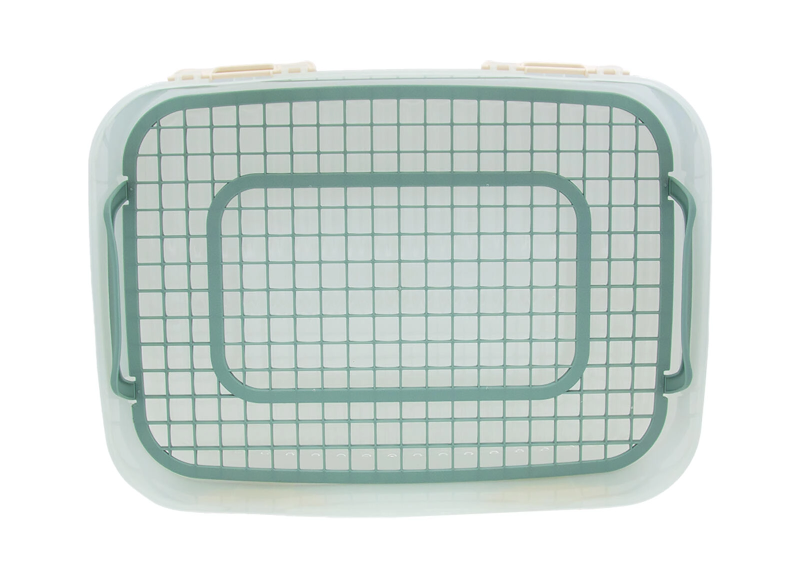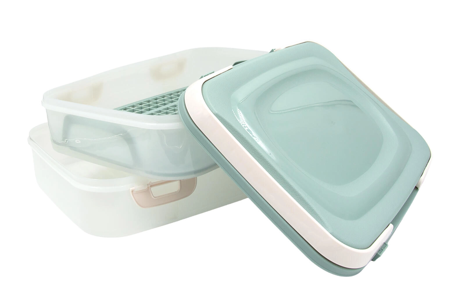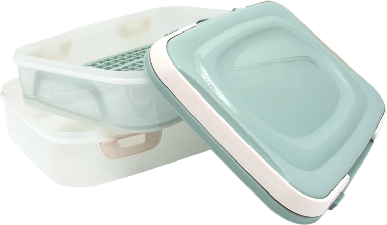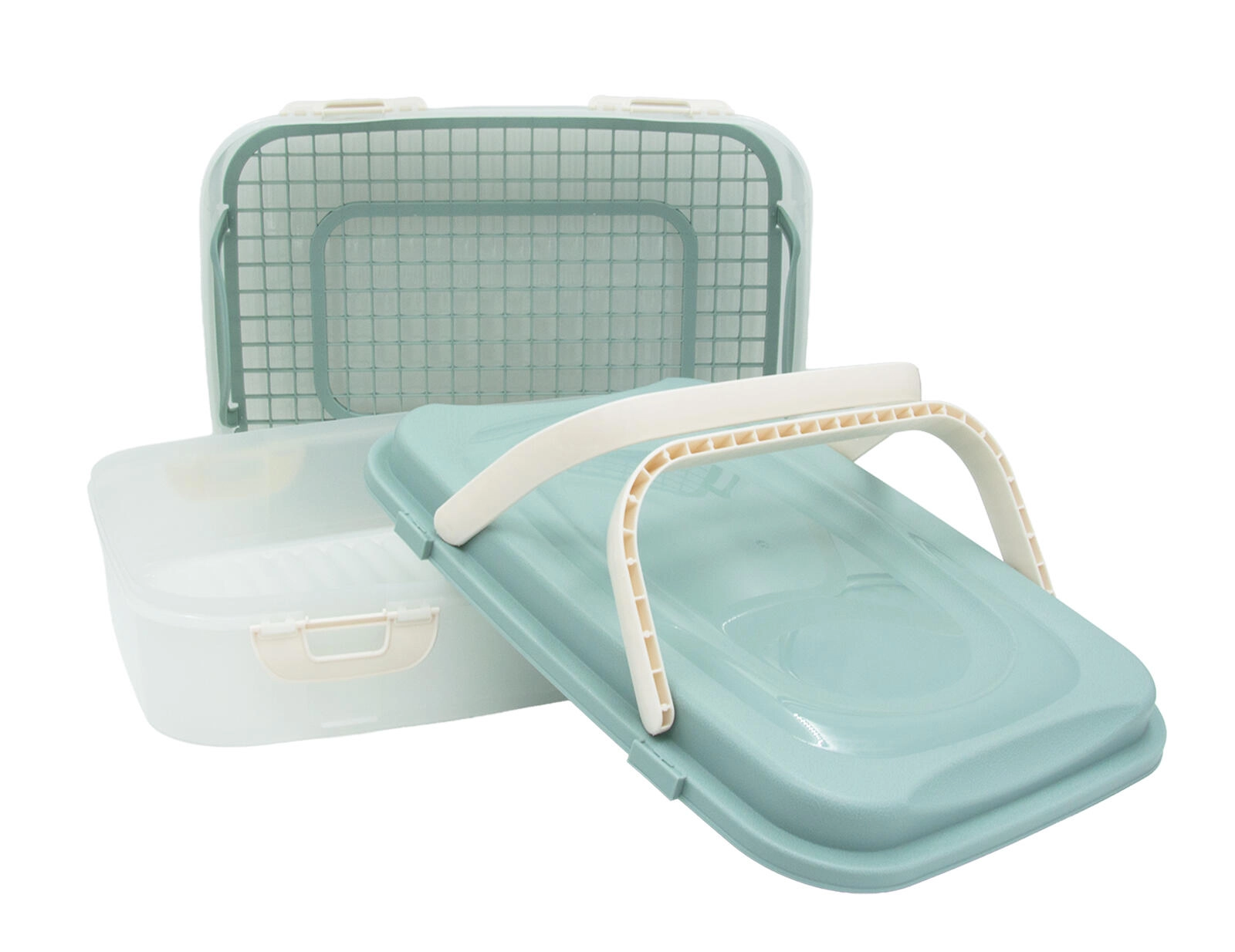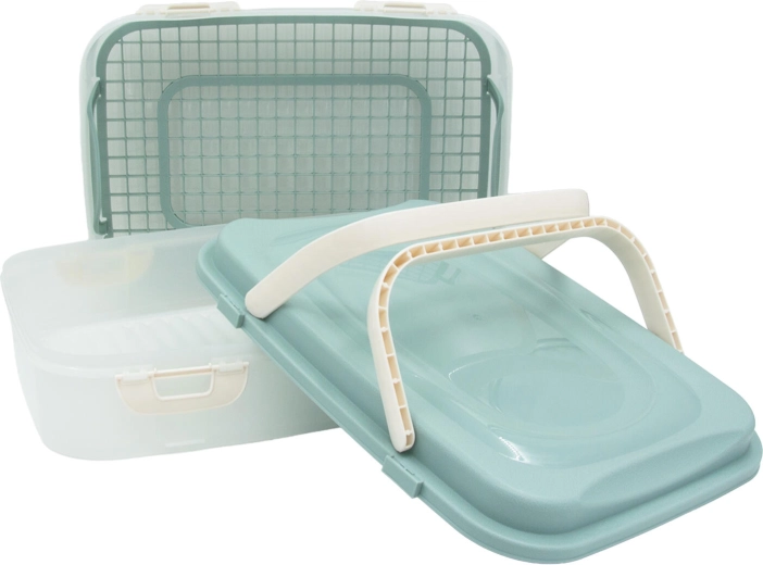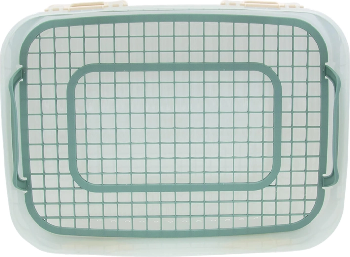 Include o grilă interioară cu mânere, datorită căreia puteți scoate cu ușurință prăjituri delicate, sandvișuri sau fructe fără a le strivi. Construcția din plastic rezistent se curăță ușor, iar designul stivuibil economisește spațiu în frigider și la transport.