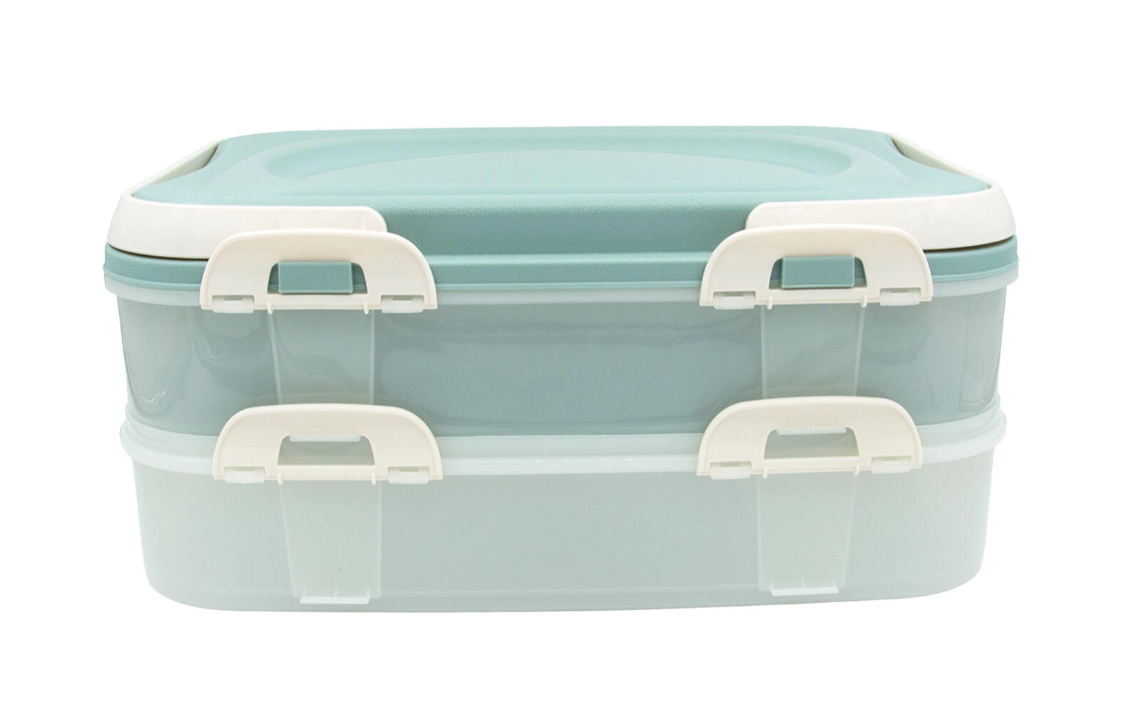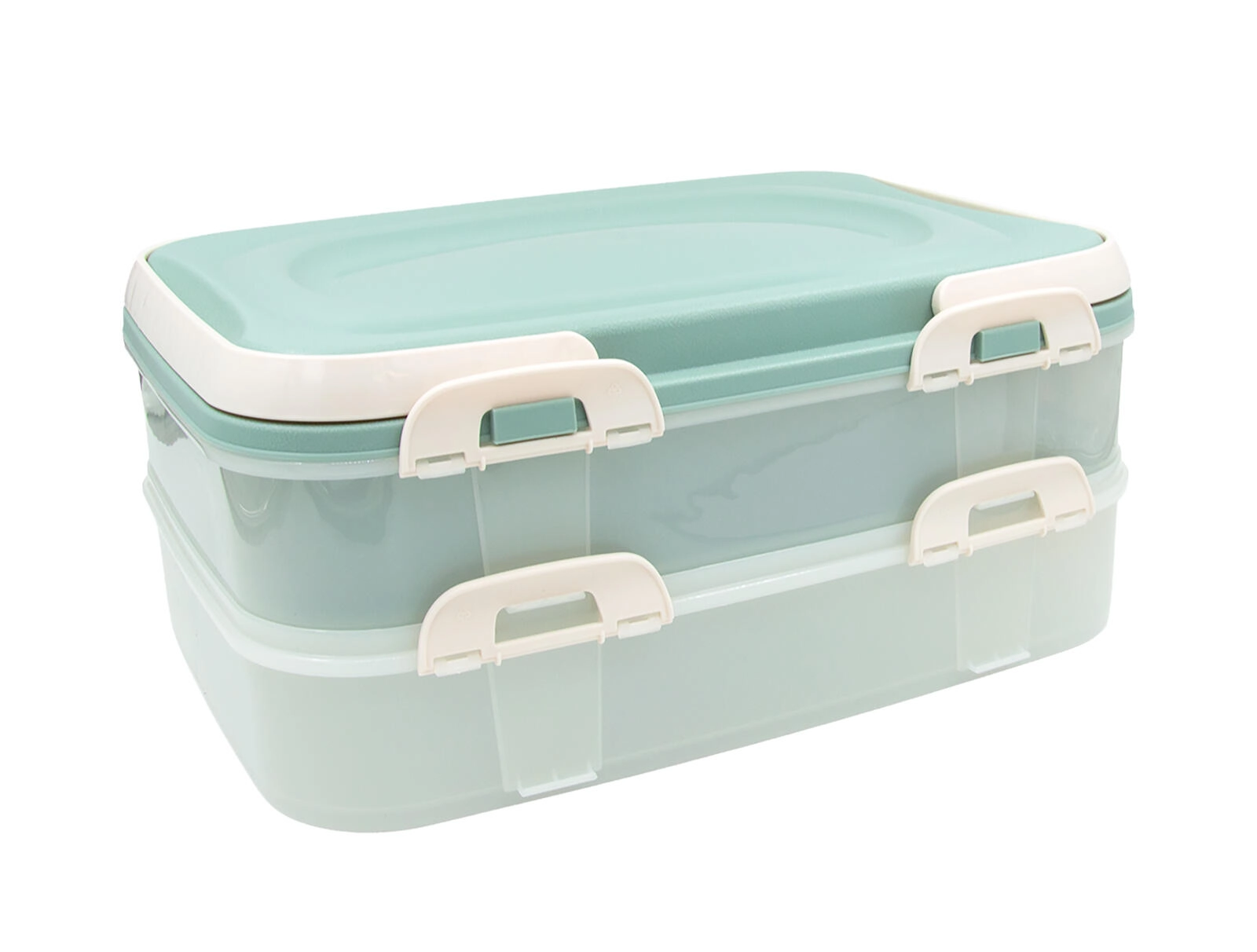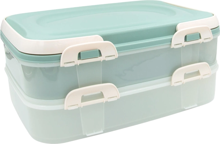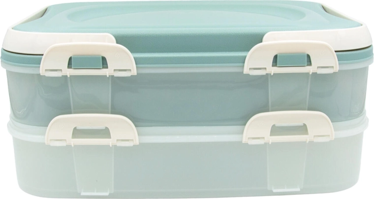 Cutia party pe două niveluri, în elegantă culoare mentă, este un ajutor de încredere pentru transportul și depozitarea organizată a alimentelor. Pereții transparenți facilitează controlul conținutului, clemele de închidere asigură sigilarea fermă, iar capacul cu mânere rabatabile oferă un transport confortabil.