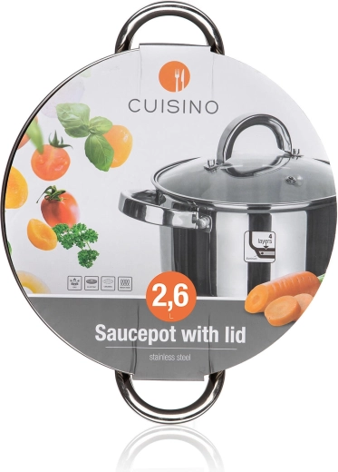 Practică oală din inox CUISINO cu volum de 2,6 l și diametru de 18 cm, cu capac din sticlă, ideală pentru gătitul zilnic. Oferă suprafață lucioasă la interior și exterior, scară de măsurare interioară pentru dozare precisă și mânere din inox robuste precum și knob. Este potrivită pentru toate tipurile de plite și va deveni un ajutor de încredere în bucătăria ta.