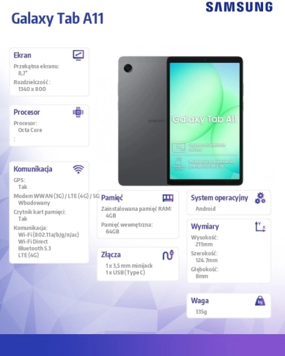 Galaxy Tab A11 în formatul compact de 8,7" oferă un echilibru perfect între portabilitate și confort pentru vizionarea videoclipurilor, citit și navigare web. Datorită 4G/LTE rămâi online chiar și fără Wi‑Fi, iar memoria mare 8 GB RAM + 128 GB stocare asigură spațiu pentru aplicații, fotografii și conținut offline.