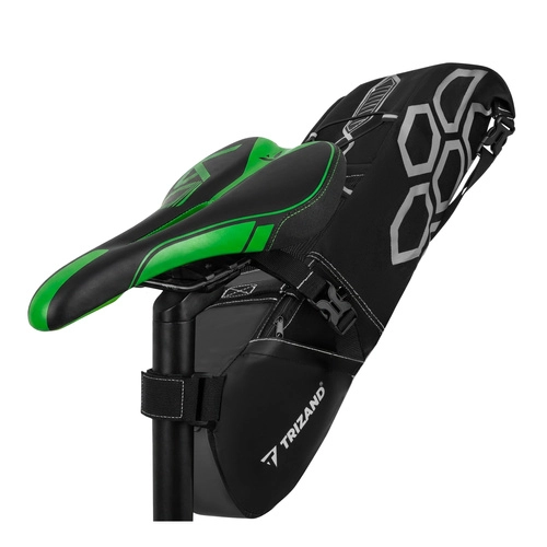 Cauți spațiu de depozitare fiabil pe bicicletă fără să porți rucsac? Geanta sub șa TRIZAND cu volum de 12 litri găzduiește tot ce ai nevoie pentru ture și bikepacking – de la unelte și camere până la haine sau gustări. Țesătura rezistentă cu strat PU protejează conținutul de umiditate și murdărie, iar imprimeul reflectorizant îmbunătățește vizibilitatea pe înserat.
