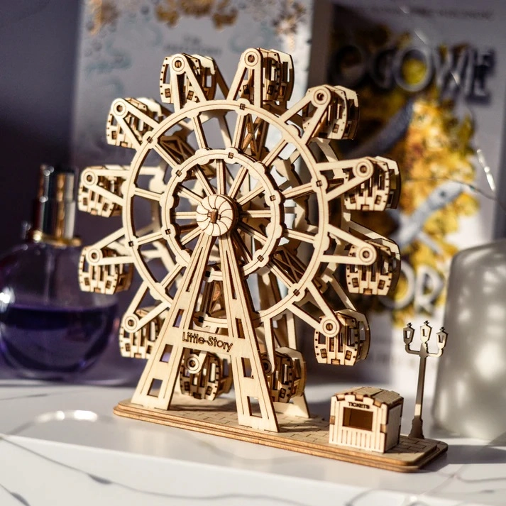 Puzzle-ul 3D din lemn Little Story Roata Panoramică este ideal pentru copiii mai mari, adolescenți și adulți care iubesc creația creativă și experiența detaliată a modelismului. Datorită construcției bine gândite, vei asambla modelul fără adeziv, pur și simplu desprinzând piesele din placă și îmbinându-le conform instrucțiunilor detaliate.
