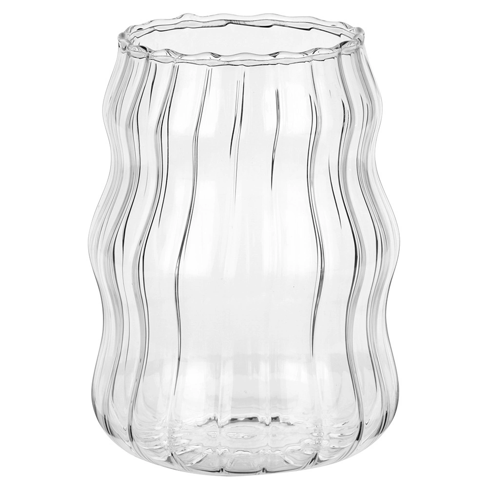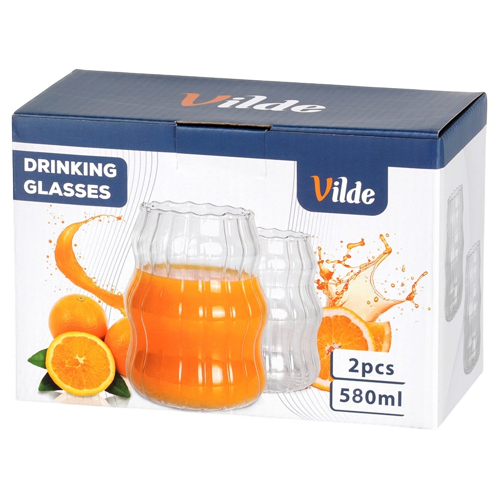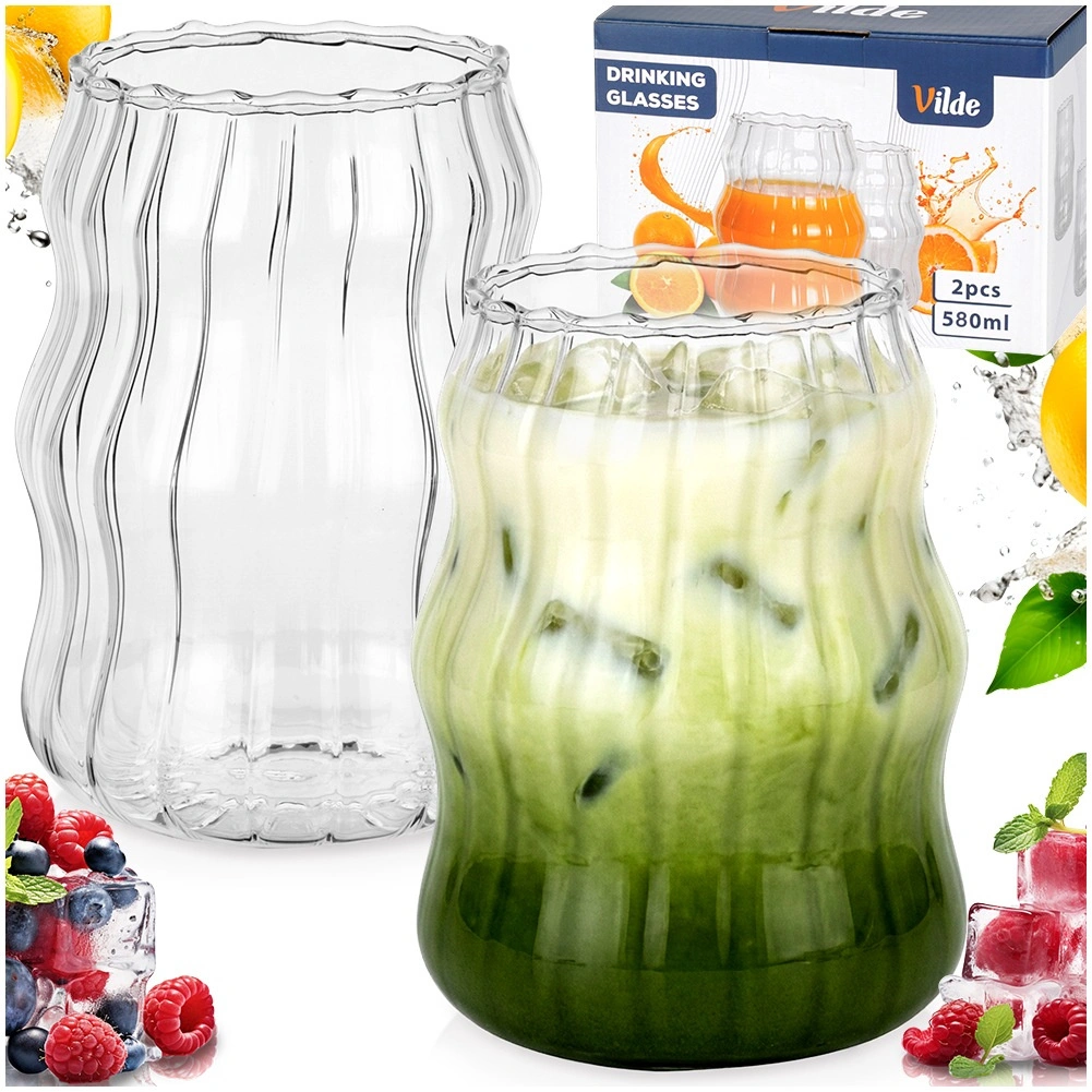 Set stilat de două pahare cu capacitatea de 580 ml, din sticlă borosilicată rezistentă. Datorită formei ondulate și striațiilor verticale, se așază perfect în mână și evidențiază frumos băuturile. Potrivite pentru băuturi reci și calde, rezistente de la -20 °C până la +120 °C, pot fi spălate în mașina de spălat vase și folosite în cuptorul cu microunde.