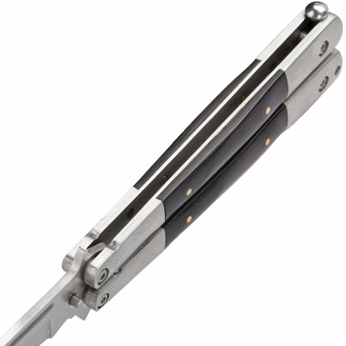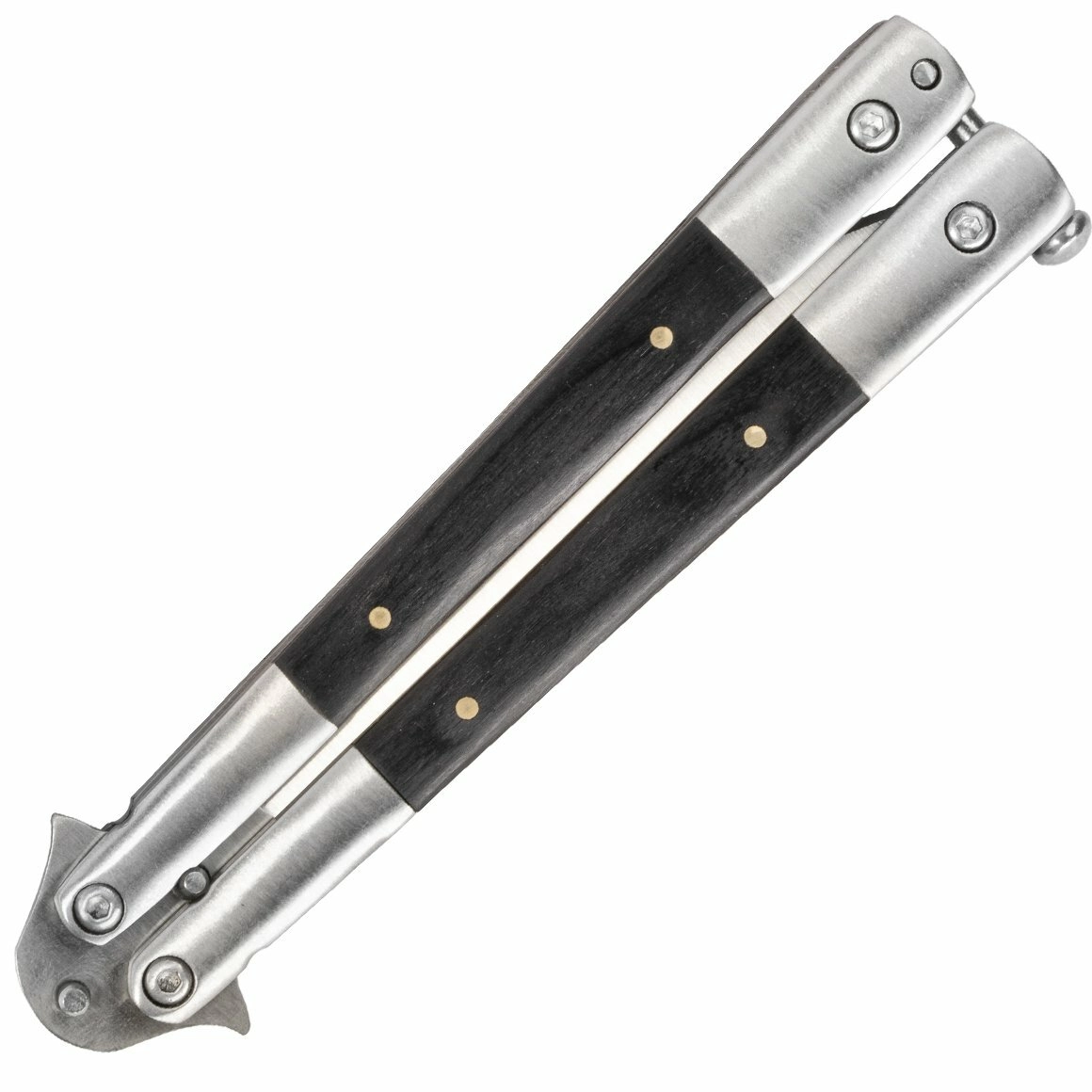 Mânerul din Pakkawood compozit (combinație de lemn și rășini epoxidice) cu întărituri din inox asigură priză fermă și durată de viață îndelungată. Clapa posterioară fixează în siguranță brațele atât în poziția deschisă, cât și închisă, pivoții rotaționali oferă deschidere lină, iar clipul permite purtare discretă în buzunar.