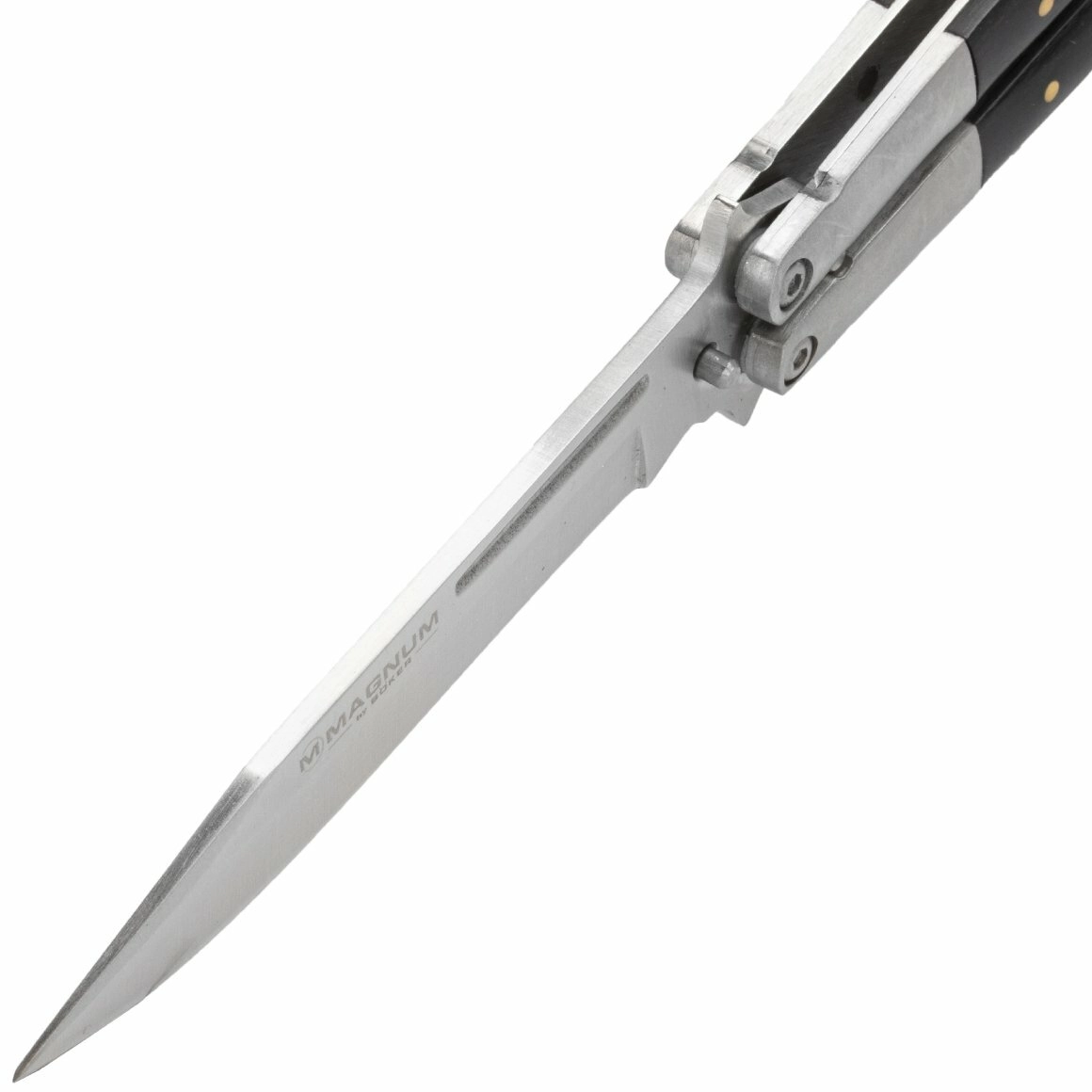 Magnum Wood oferă performanță fiabilă într-un format compact. Lama de tip Drop Point cu tăiș neted și șlefuire plată este din oțel inoxidabil 440C, care se remarcă prin rezistență ridicată la coroziune și retenție bună a tăișului. Finisajul satinat conferă un aspect elegant și ușurează întreținerea.