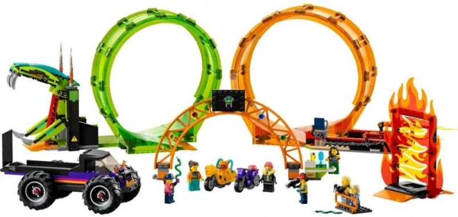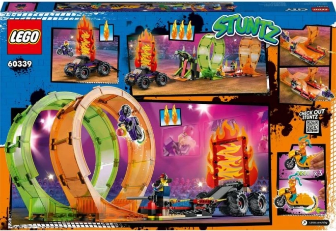 Setul LEGO City Stuntz Dublă buclă pentru cascadorii oferă copiilor de la 7 ani posibilități nesfârșite de joacă. Configurația arenei cu buclă în flăcări, buclă cu gura de șarpe și spectaculosul perete de foc ridică trucurile de cascadorie la un nou nivel. Motocicletele cu volant prind ușor viteză și intră în acțiune, în timp ce monster truck-ul cu rampă încheie show-ul cu un salt grandios.