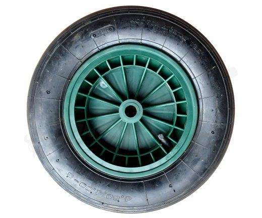 Roata pneumatică universală, de culoare verde, pentru roabele LIVEX, oferă rulare fiabilă și confortabilă. Datorită diametrului de 390 mm și lățimii anvelopei de 90 mm, asigură deplasare lină, amortizare eficientă a denivelărilor și durată de viață îndelungată la lucru în grădină sau pe șantier.