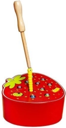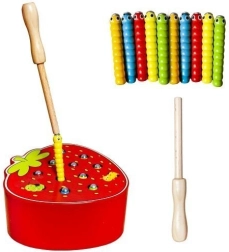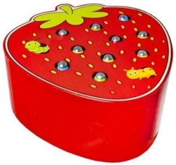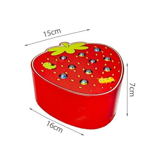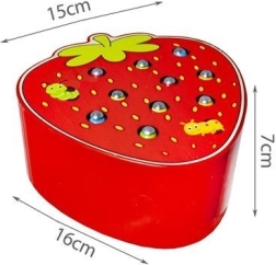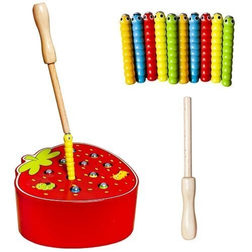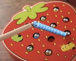 Un joc din lemn amuzant, în forma unei căpșuni delicioase, care dezvoltă motricitatea fină și concentrarea. Copiii scot și introduc viermișorii în orificii cu ajutorul unei baghete magnetice. Jocul este realizat din materiale sigure și are culori vii, care îi motivează pe cei mici să se joace și să învețe. O alegere grozavă pentru dezvoltarea coordonării ochi–mână, a creativității și a răbdării.