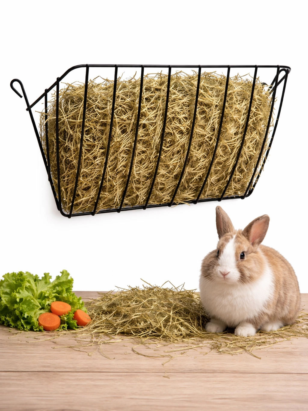 Ieslele mari pentru fân destinate iepurilor, cu umplere practică pe sus, asigură o hrănire curată și igienică. Construcția deschisă din sârmă permite acces facil animalelor, în timp ce fânul rămâne deasupra așternutului și nu se irosește.
