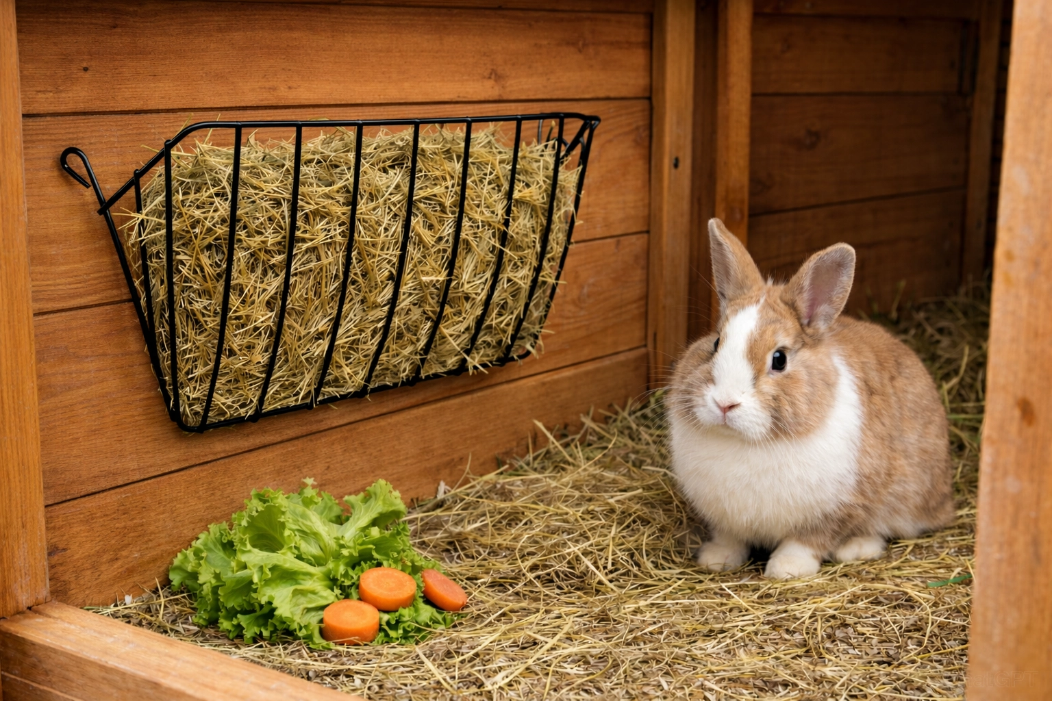 Umpleți ieslea de sus și păstrați fânul deasupra așternutului – mai puține pierderi, mai multă curățenie și o igienă mai bună în cotețul pentru iepuri.