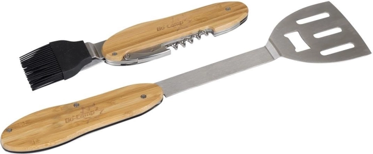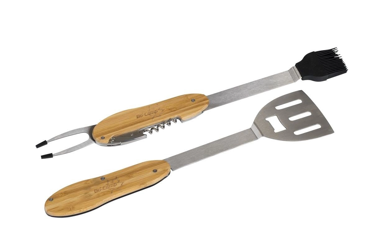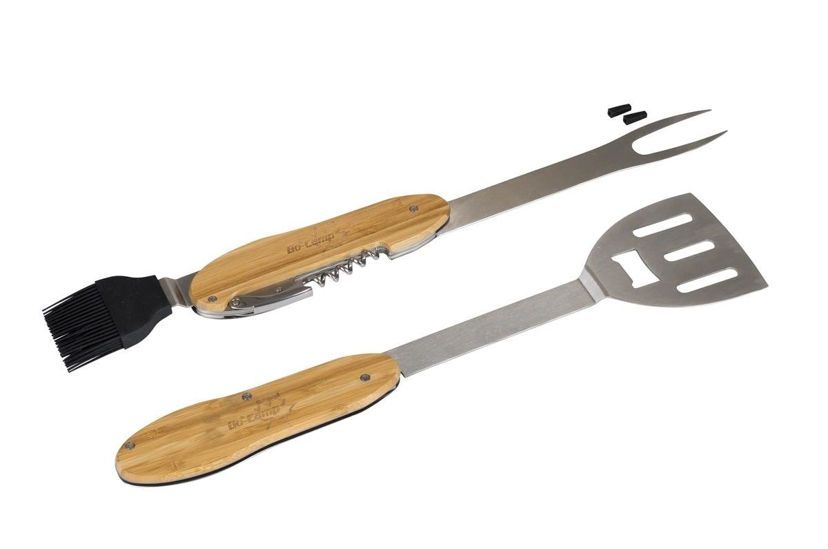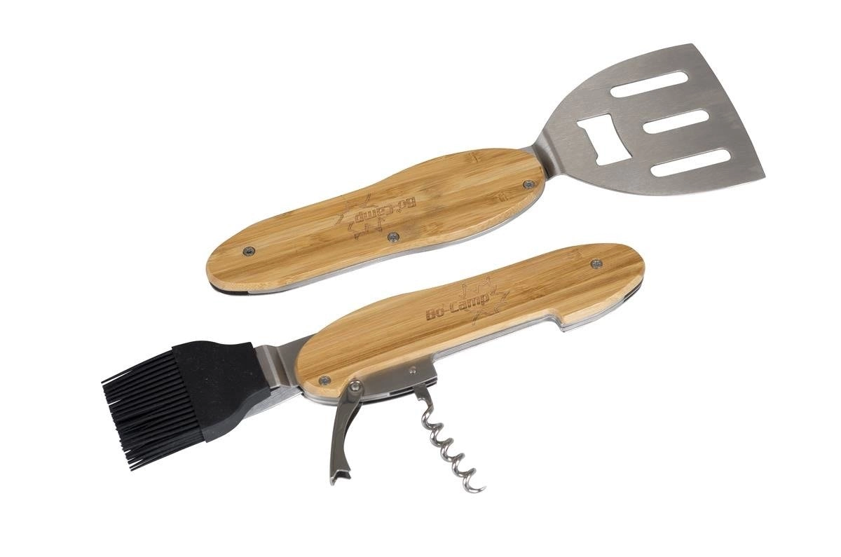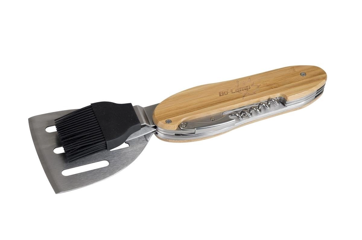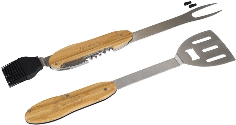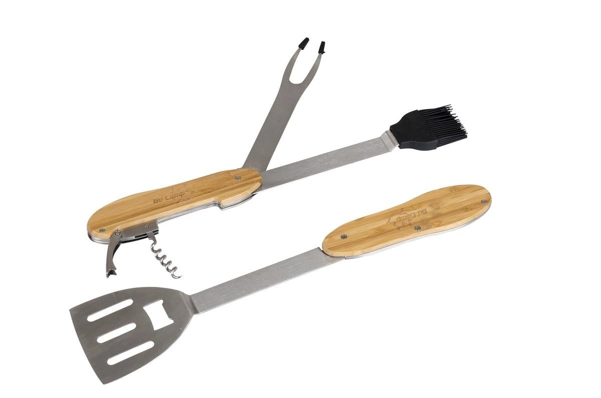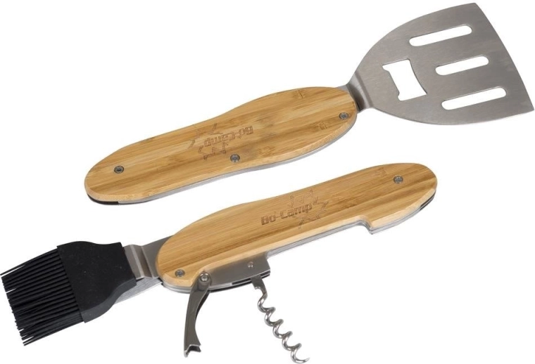 Paleta, furculița, pensula din silicon, tirbușonul și desfăcătorul sunt inteligent integrate într-un singur set compact. Perfect pentru grătare rapide și organizate.