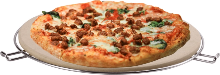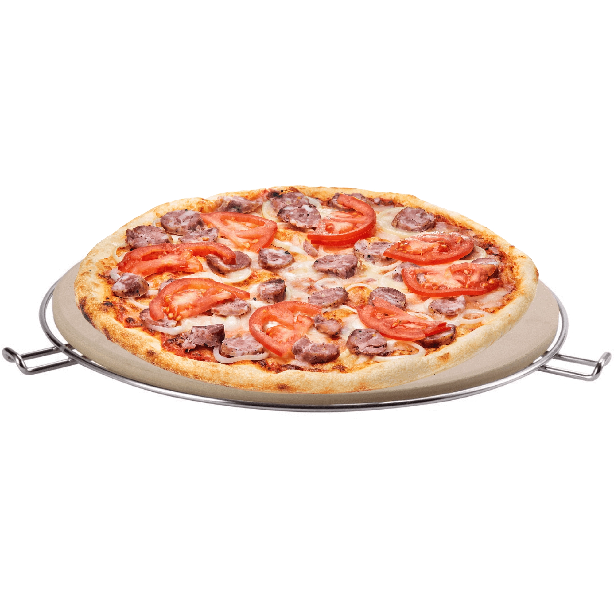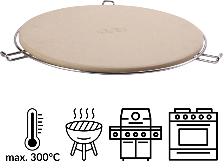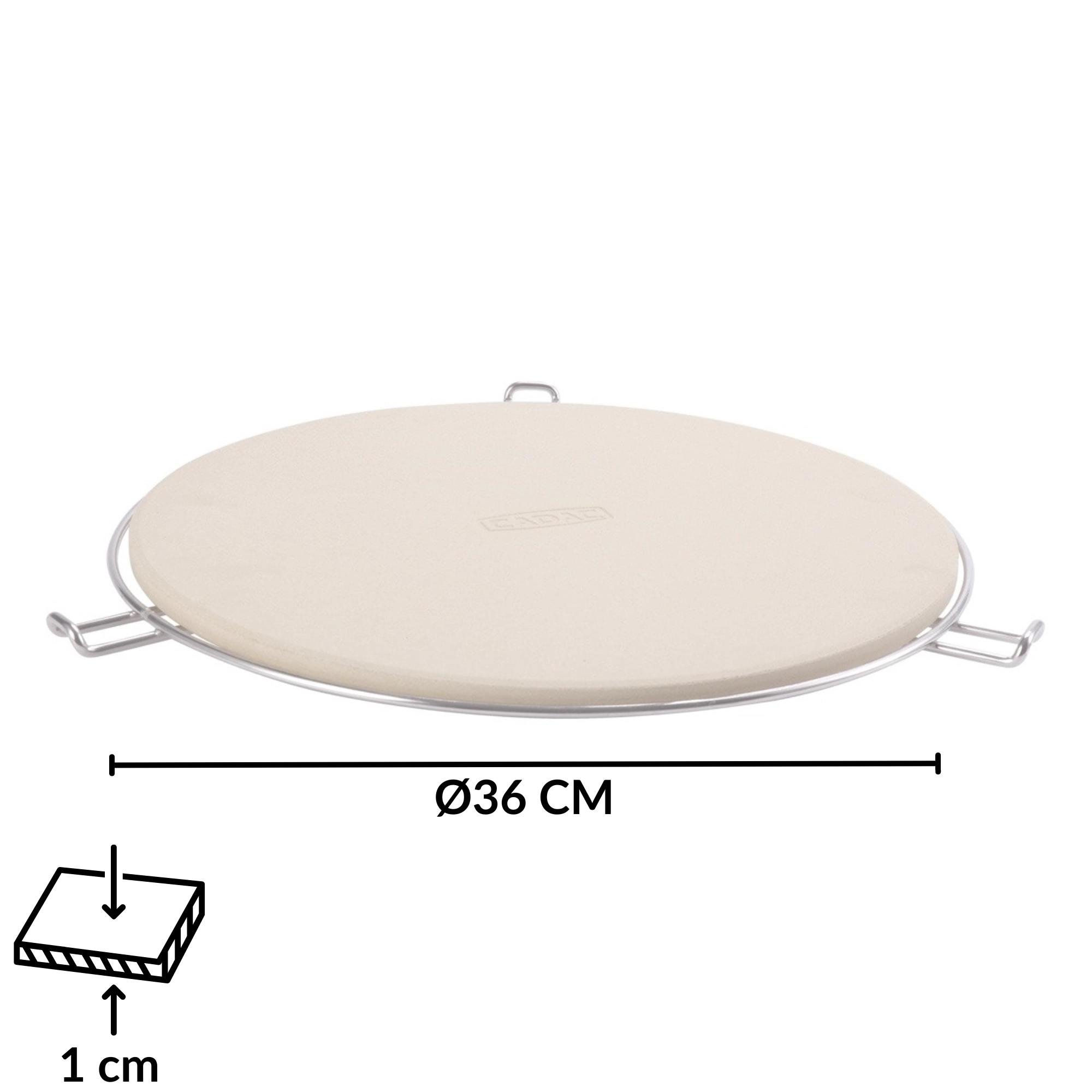 Pachetul include un suport cromat cu mânere laterale, care facilitează transferul pietrei încinse de pe grătar sau din cuptor pe masă. Datorită rezistenței până la 300 °C și formei circulare universale, este perfectă pentru pizza, focaccia și pâine.