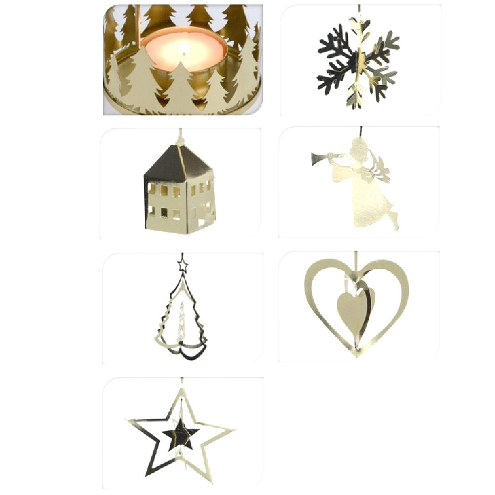 Caruselul este livrat într-unul dintre cele șase motive frumoase – de la fulgi de iarnă până la inimioare romantice. Trebuie doar să introduceți o lumânare tip pastilă și să vă bucurați de o atmosferă plăcută și caldă în timpul meselor de sărbătoare, al relaxării sau al serilor liniștite.