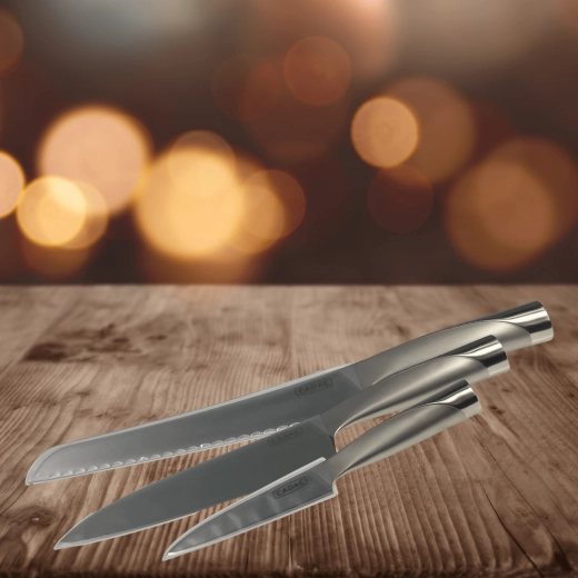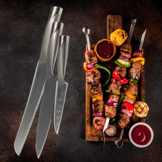 Setul include trei cuțite esențiale: paring (12 cm) pentru lucrări detaliate cu fructe și legume, cuțit de bucătar (20 cm) ca instrument universal pentru tăiere și tocare și cuțit zimțat pentru pâine (20 cm), care face față atât cojii crocante, cât și miezului moale.
