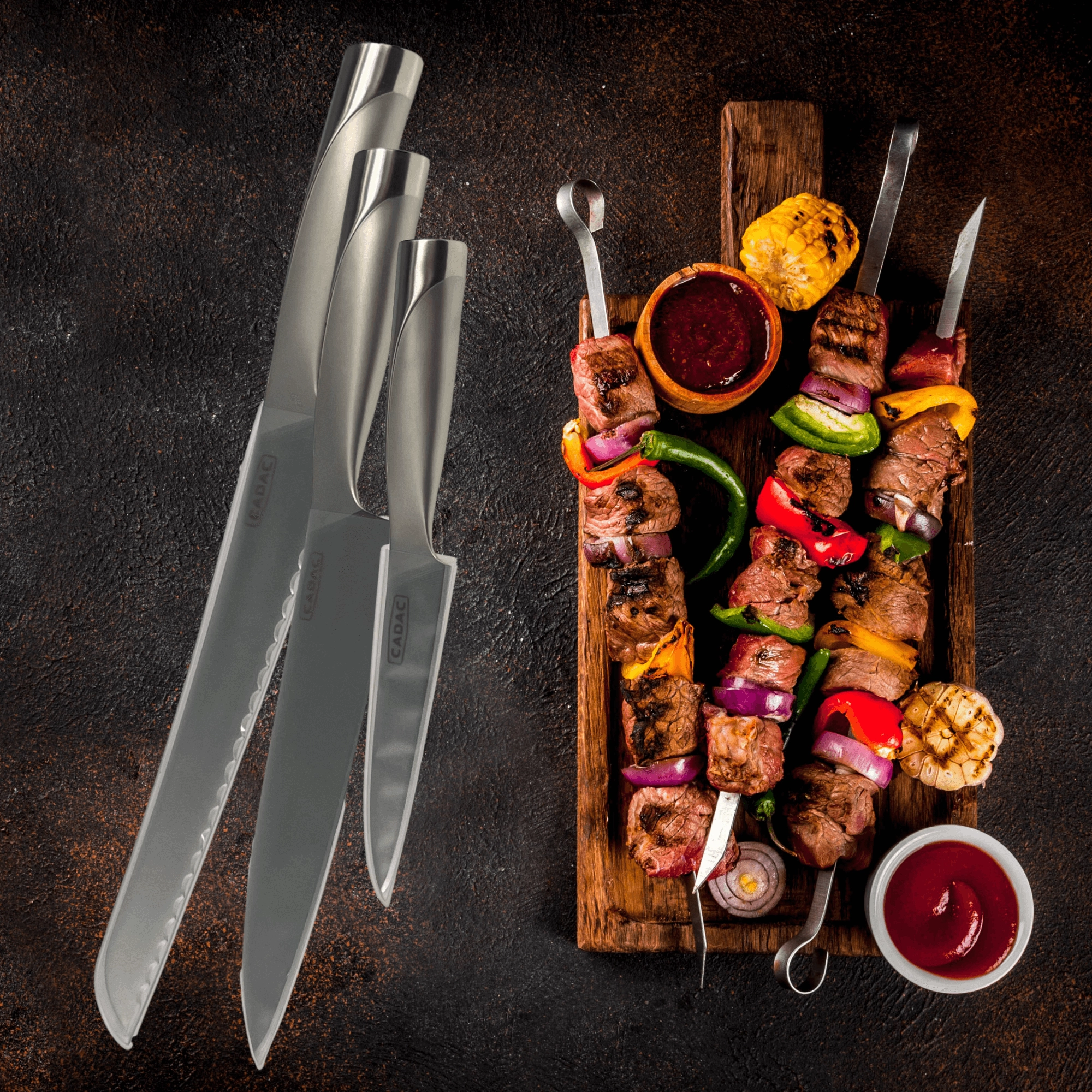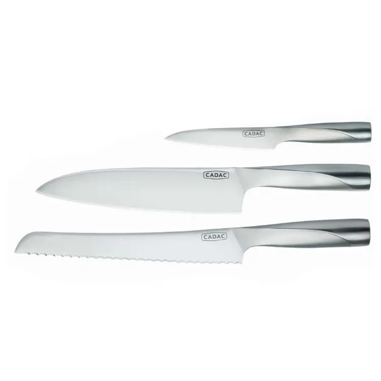 Paring 12 cm pentru lucrări de finețe, cuțit de bucătar 20 cm ca instrument universal și cuțit zimțat pentru pâine 20 cm pentru produse de panificație.
