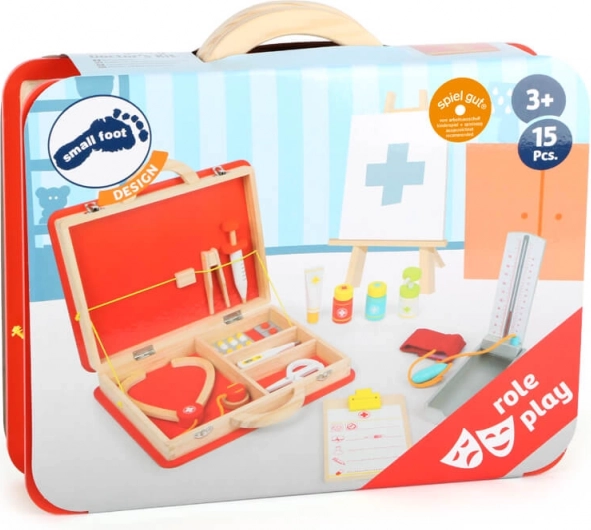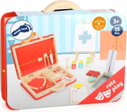 Acest set de salvare din lemn, de calitate, în gentuță, este ideal pentru jocurile de-a doctorul. Datorită dotărilor bogate și elementelor funcționale, precum pompițele la seringi și dozatoare, copiii pot îngriji realist păpușile și plușurile, pot măsura tensiunea arterială și pot nota totul în propria documentație medicală.